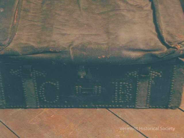 Black leather trunk. One end is decorated with brass brads along the edge, surrounding the hinges, and forming the initials "C.B."Context