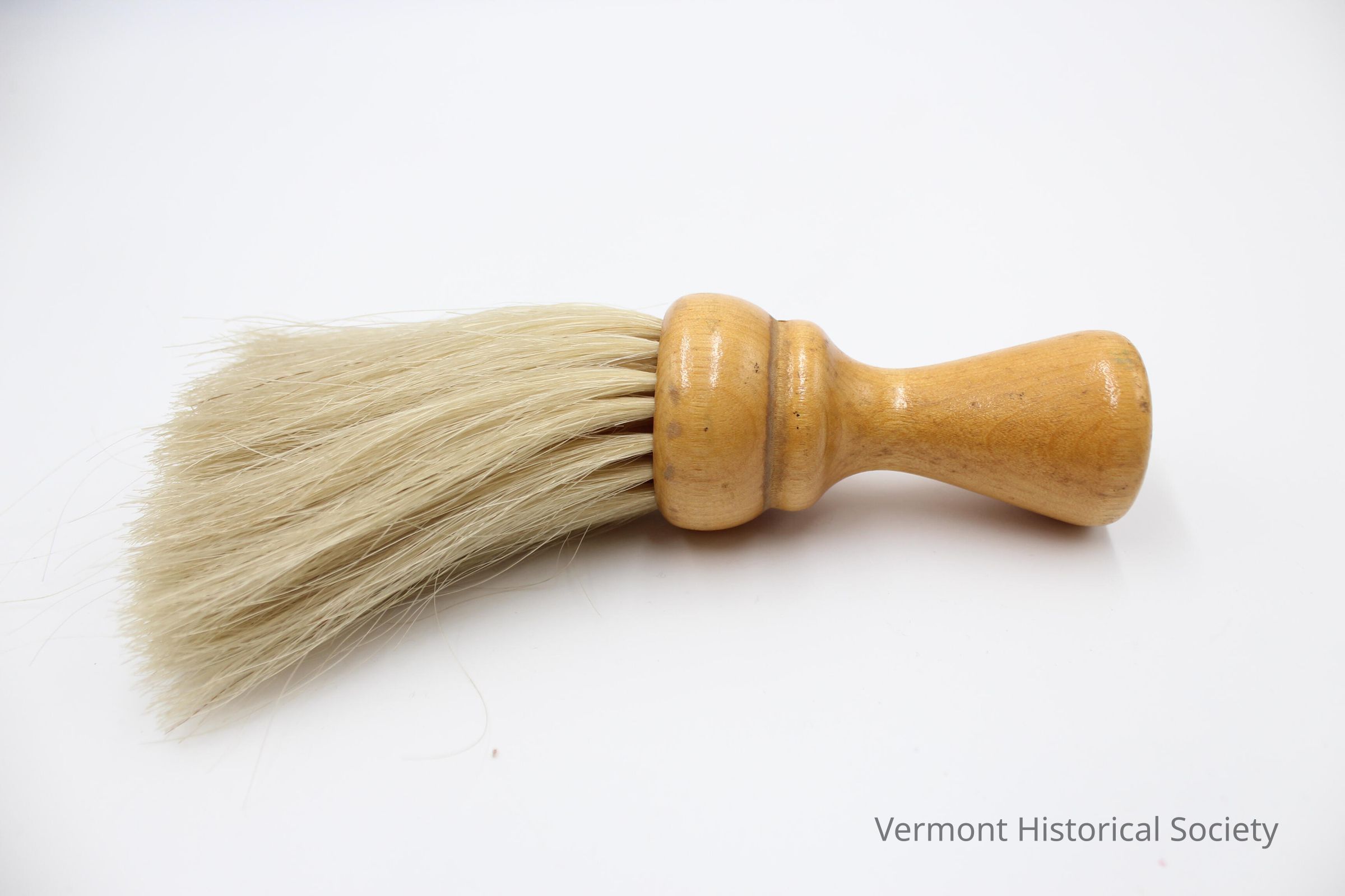 Round brush with a turned wooden handle and white horsehair bristles. The short handle flares at the end, and has simple decorative molding near the bristles. The bristles are attached in small groups into several holes drilled into the handle.Context