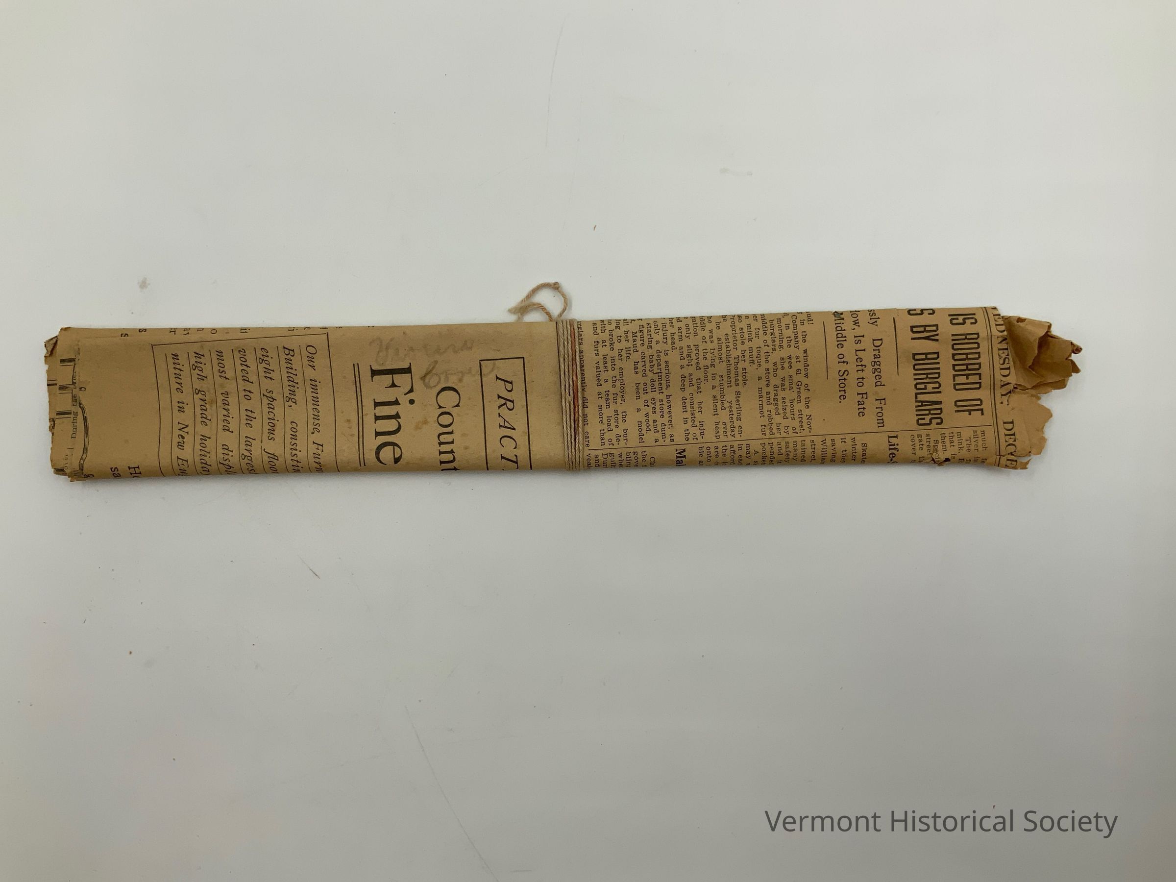 Sewing pattern cut from a newspaper. The pattern pieces are folded, then rolled together and tied with white cotton twine. The outermost piece is labeled in pencil, "Violin Case".Context