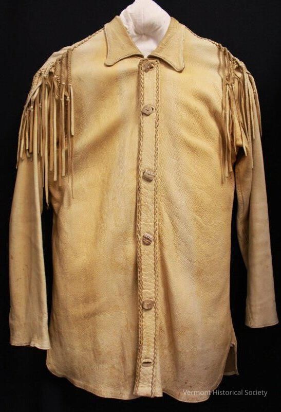 Man's deerskin jacket with six antler buttons down the center front. The front placket with the buttonholes is trimmed with thin strips of hide braided into a rope-like trim on either side of the placket. Deerskin braided fringe is attached to each shoulder and the back yoke. Each sleeve has a gusset at the wrist, inserted into the sleeve's seam. The sleeves are laced into the bodice with a narrow strip of deer hide. The hem is curved with side slits. The jacket is unlined. There is no maker's label.Context