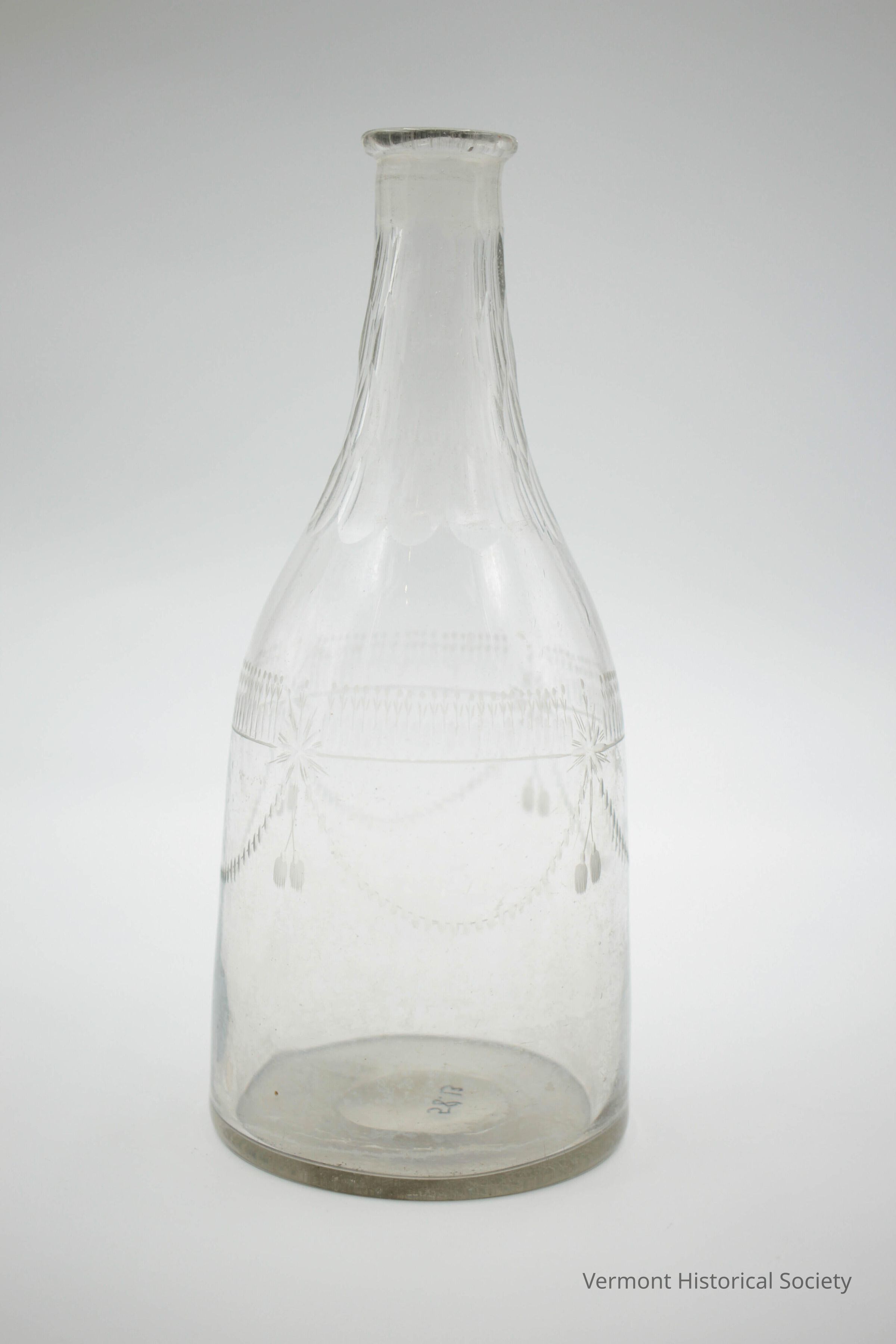 Clear glass decanter etched around the shoulder with a tassel and rope design. The neck is cut into facets.