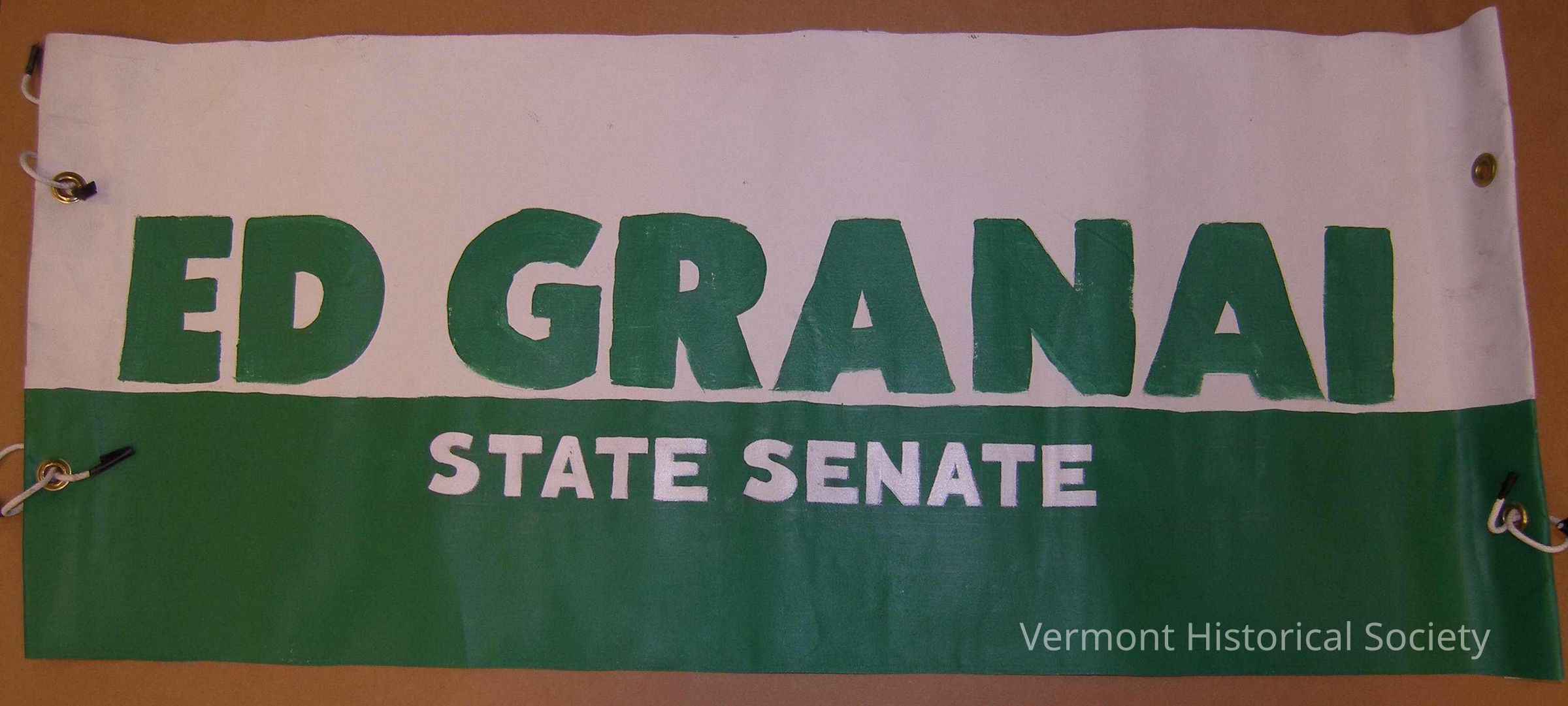 Painted banner that reads, "ED GRANAI STATE SENATE". The banner has a white ground on the upper half and a green ground on the lower half, with the lettering in the opposite colors. The ends are folded back and held with 4 large metal grommets.