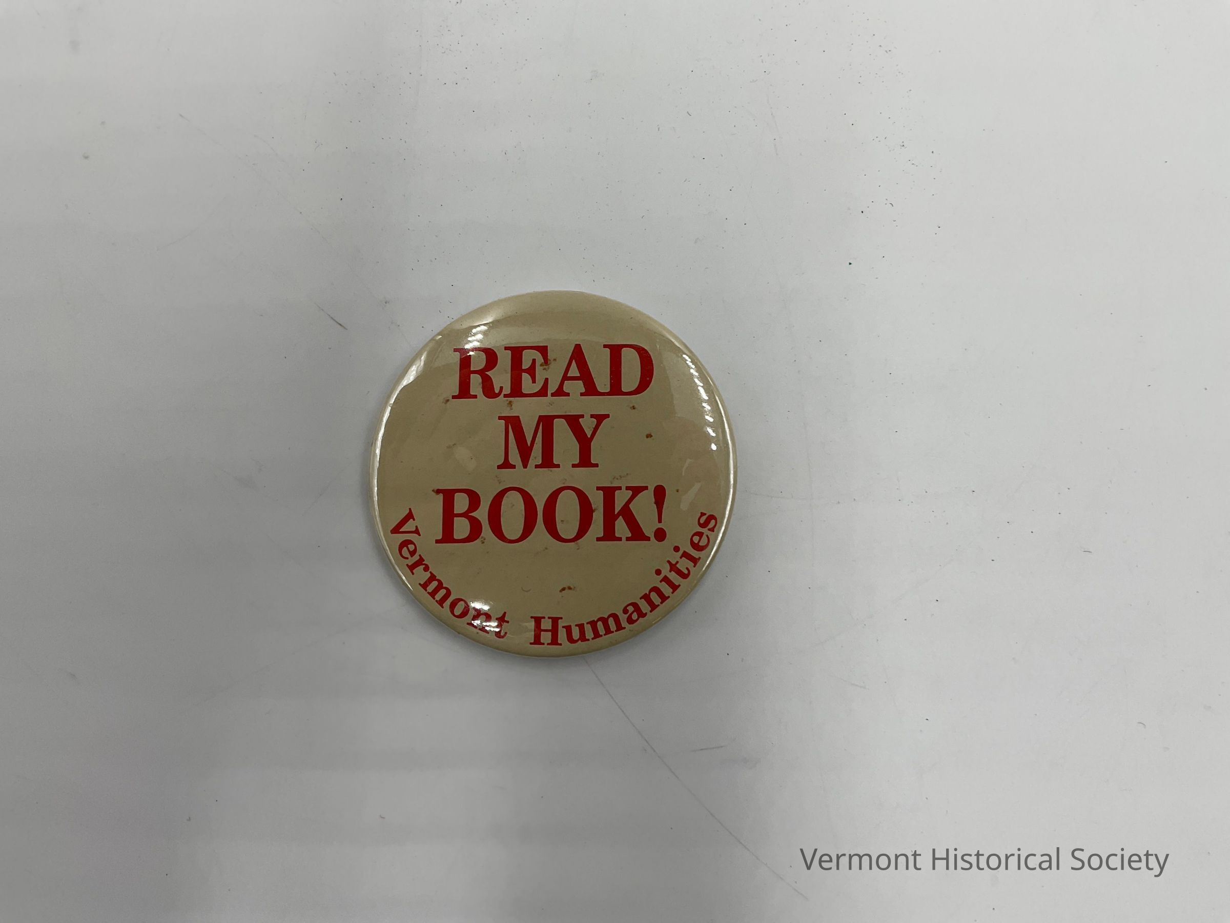 Large white pin with red lettering that says, "Read My Book! Vermont Humanities."Context
