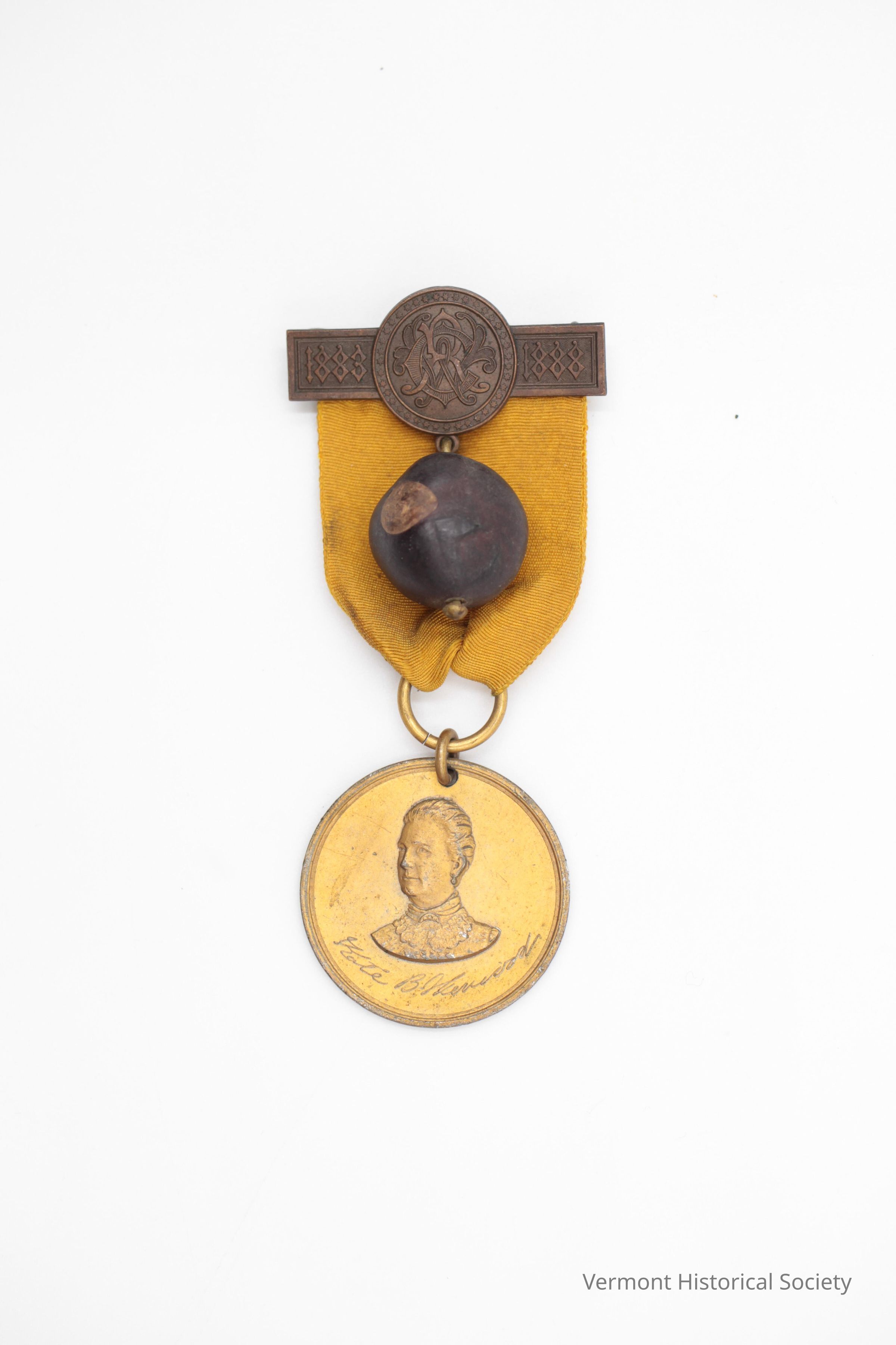 Membership ribbon consisting of a rectangular bar, a yellow ribbon, and a round medallion. The bronze bar has a central medallion with the monogram WRC flanked by the dates 1883 and 1888. There is a hinged pin on the reverse. A buckeye nut hangs from the bar in front of a yellow grosgrain ribbon that is looped and stitched onto a wire on the back of the bar. From an eye hook looped through the bottom of a ribbon hangs a round, gold-plated medallion showing the bust of a woman with the signature, "Kate B. Sherwood". The back of the medallion has the inscription, "VI NATIONAL CONVENTION COLUMBUS OHIO SEPT. 1888 W. R. C."Context