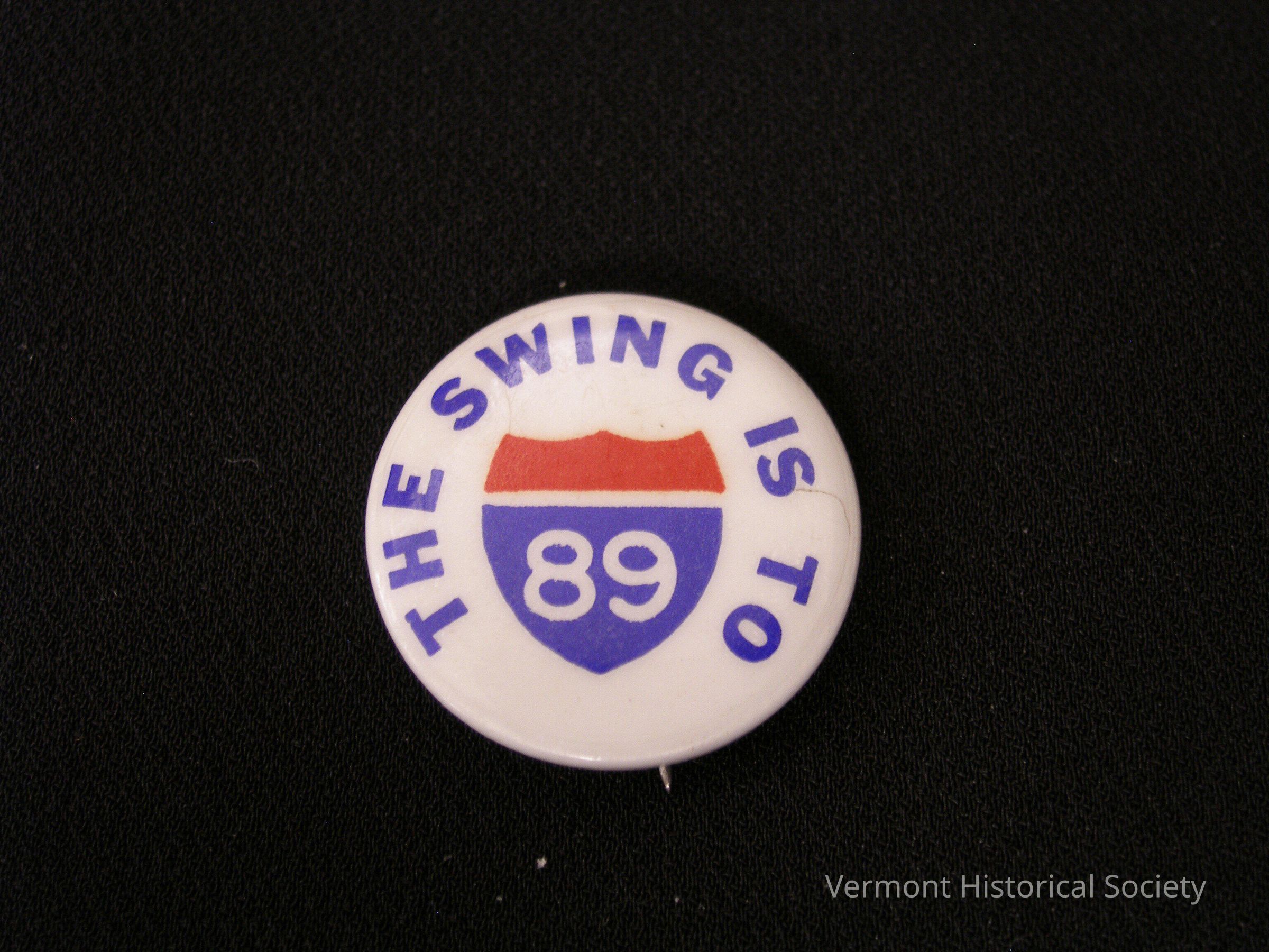 Round white metal pin printed in the center with an image of a shield that is red on the top and blue on the bottom with the number 89. The words, "THE SWING IS TO" ring the edge.Context