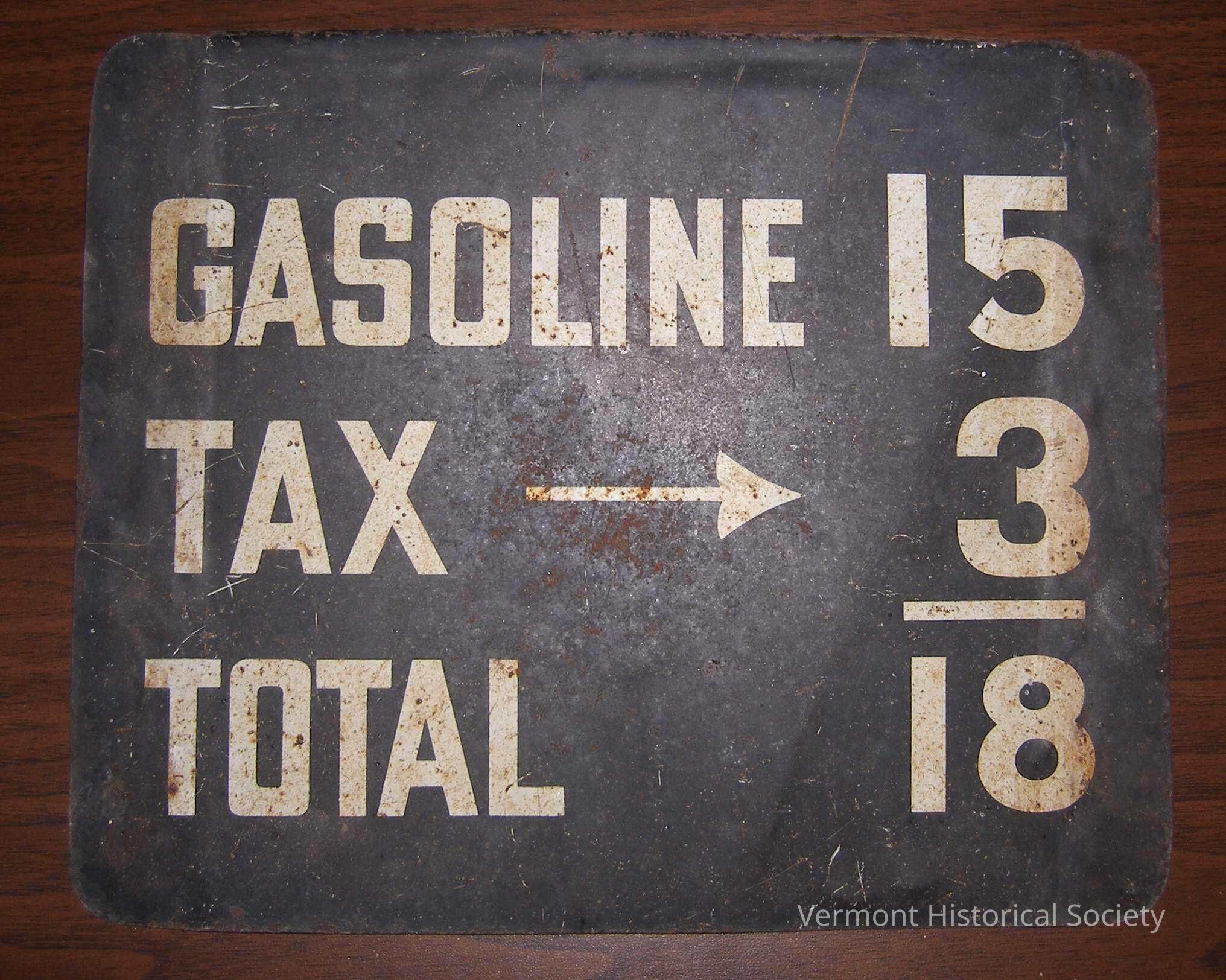 In contrast to today, gas prices in the 1930s and 40s could remain steady up to a year, making pricing signs fairly permanent. Vermont established its first tax on gasoline in 1923, reflected in the price on this sign from Perry's Service Station in Cabot, VT.