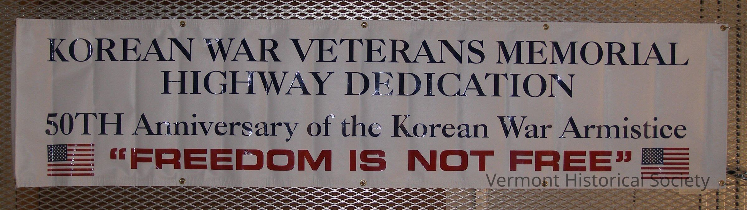 Long banner made of white vinyl. It features five brass grommets along the top edge and another five along the bottom edge. The majority of the lettering on the banner is blue, with a row of red lettering positioned at the bottom edge. At each end of the lowest row of text, there is a U.S. flag displayed. The entire piece is bordered by two rows of straight stitching, which serve to fold the edges under neatly. The text on the banner reads: "KOREAN WAR VETERANS MEMORIAL HIGHWAY DEDICATION 50TH Anniversary of the Korean War Armistice FREEDOM IS NOT FREE." The banner consists solely of text, aside from the inclusion of the two U.S. flags.Context