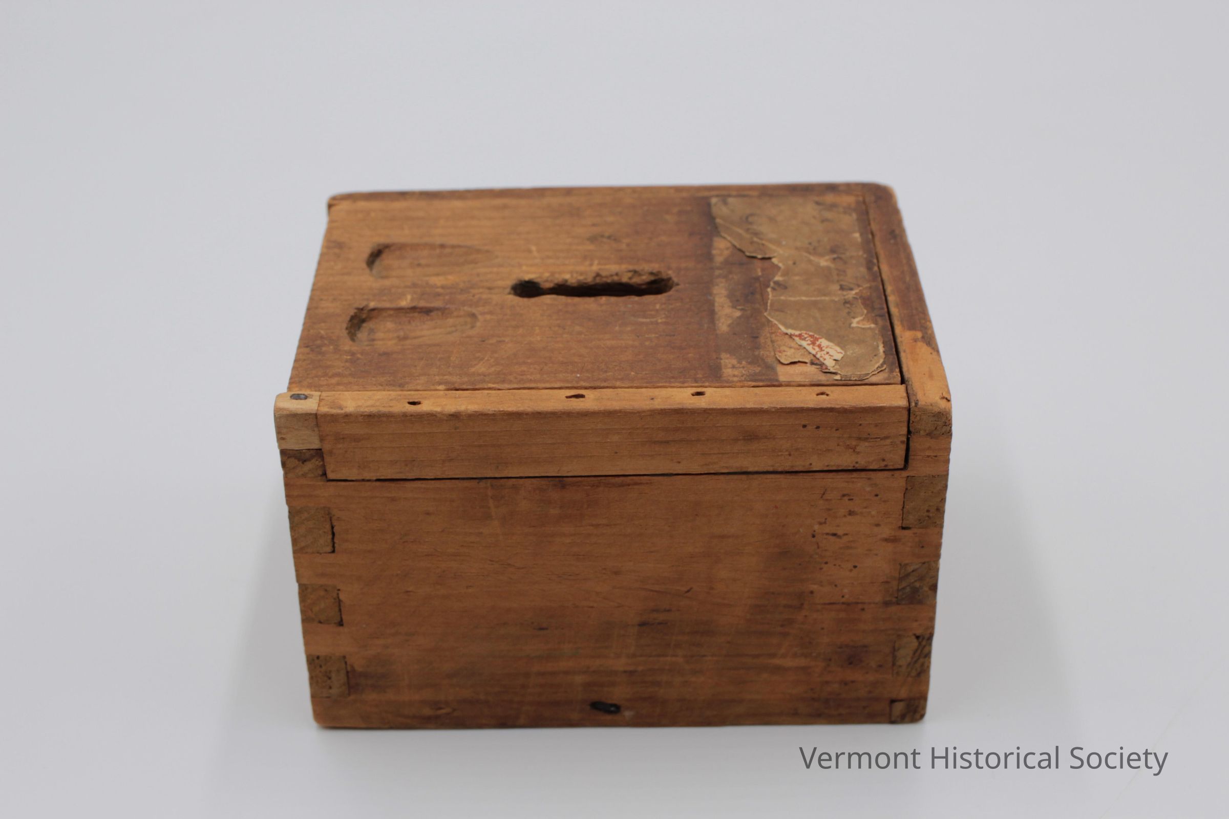 Small wooden ballot box. The box consists of two parts: a four-sided base and a slide-out top. One side of the base of the shorter than the rest, and the top slides through the gap and into a groove cut into the interior of the remaining three sides. There is a keyhole slot in the center of the top piece, and two thumb indentations for sliding the lid open. A torn, rectangular piece of a paper is attached to the lid with the inked inscription, "Representatives to Con[gress]".