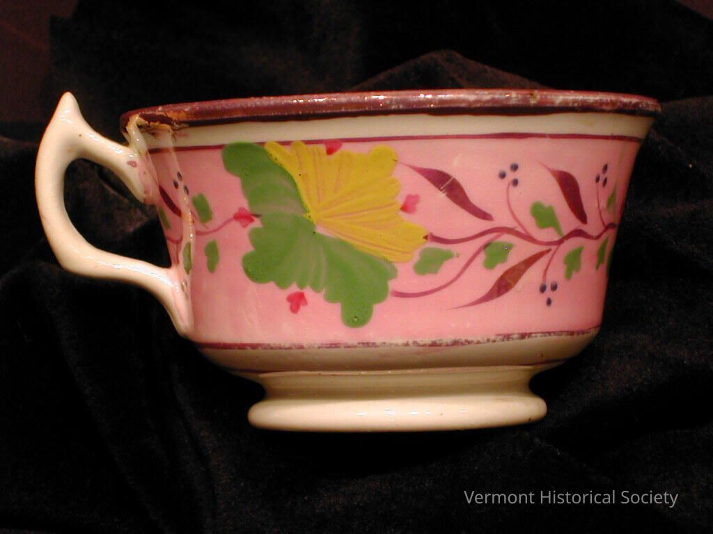 White-bodied ceramic tea cup with pink luster abstract floral design. The body of the cup is flared outward toward the lip and has a round pedestal base. The small handle is angular with a protruding tip. The design around the outside consists of a pink ground on which is painted a pink luster vine with small pink luster and green leaves and small green berries. Three large green-and-yellow leaves are placed along the vine.