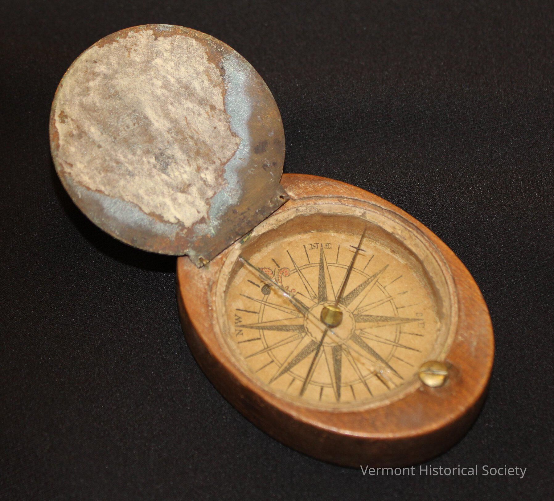 Pocket compass set into a small wooden oval with a round metal cover. The cover is engraved with the inscription, "Reuben Nash/Benson, Vt./1786", and the top of a fleur-de-lis. The first E in Reuben is floating above the the rest of the word. It opens by folding down on simple hinges formed by two wire loops. The compass itself consists of a small metal rod attached to a brass post at the center. Beneath the rod is a printed engraving of a compass rose with Prince of Wales feathers (or a small fleur-de-lis) marking the North point. The other three directions (East, South, and West) are unmarked, but the quarters are marked with initials (NE, SE, SW, NW). A printed sticker is attached to the back that reads, "Pocket Compass used by Reuben Nash, in 1786 [illegible--covered by another sticker] Presented by his gran[illeg--covered by another sticker] Henry Howard Nash, Chicago, Illinois, To the Vermont Historical Society. 1889."Context