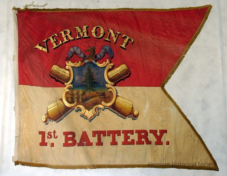 Regimental flag of the 1st Vermont Light Artillery Battery. Silk flag, swallowtail form, with red upper half and and white lower half, crossed cannons behind Vermont state coat of arms painted at center. The word, "VERMONT", is painted in gold at the top, and the words, "1st BATTERY." are painted in red at the bottom.Made/Created