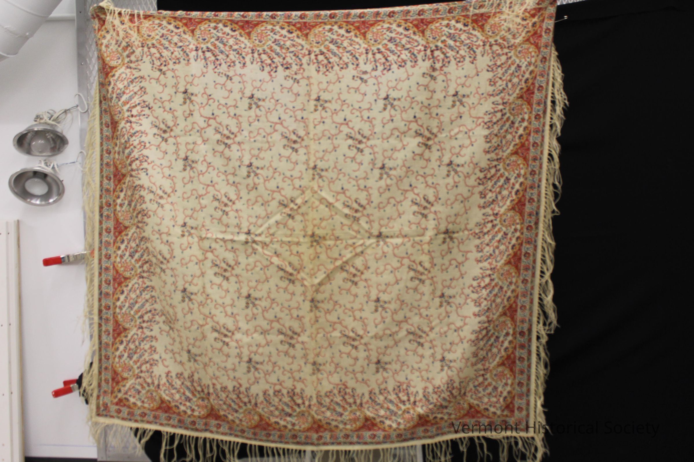 Square wool shawl with fringe on 4 sides. The shawl is printed with a floral and coral pattern throughout, with a red Indian-inspired border around all edges. The fringe is tied on through evenly spaced holes.