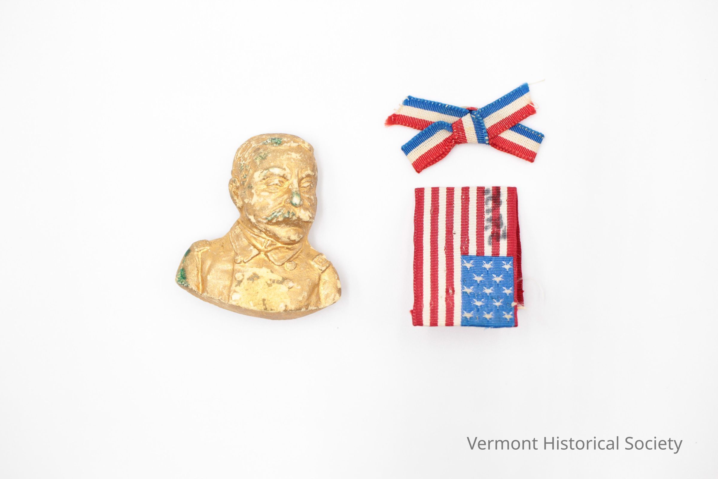 Parts of a commemorative medal, consisting of a gold-plated pin in the shape of Admiral Dewey's bust, a ribbon woven to look like a United States flag, and a narrow red-white-and-blue ribbon tied into a bow.Context