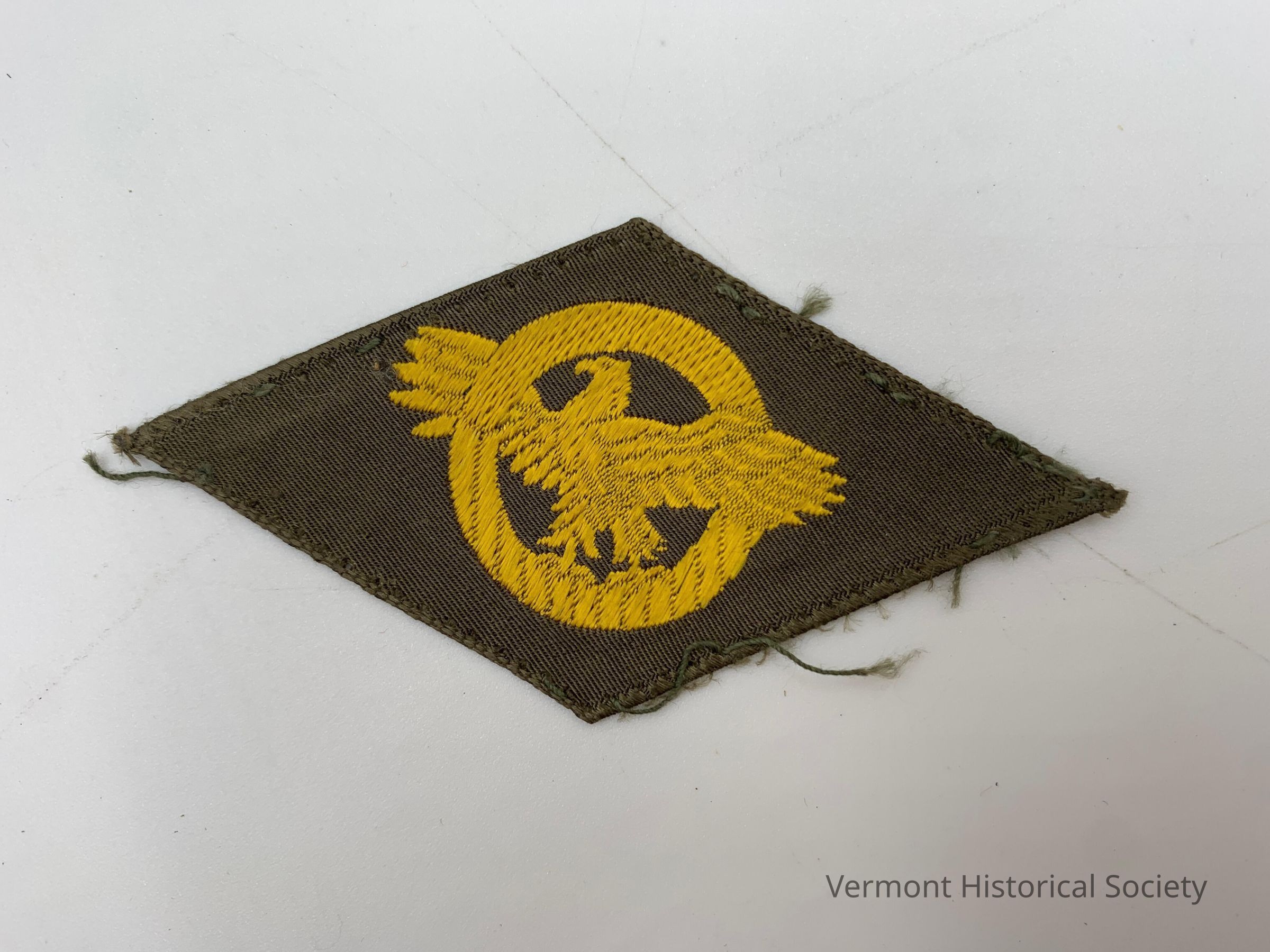 Diamond shaped green insignia patch embroidered in yellow with an eagle in a circle.Context