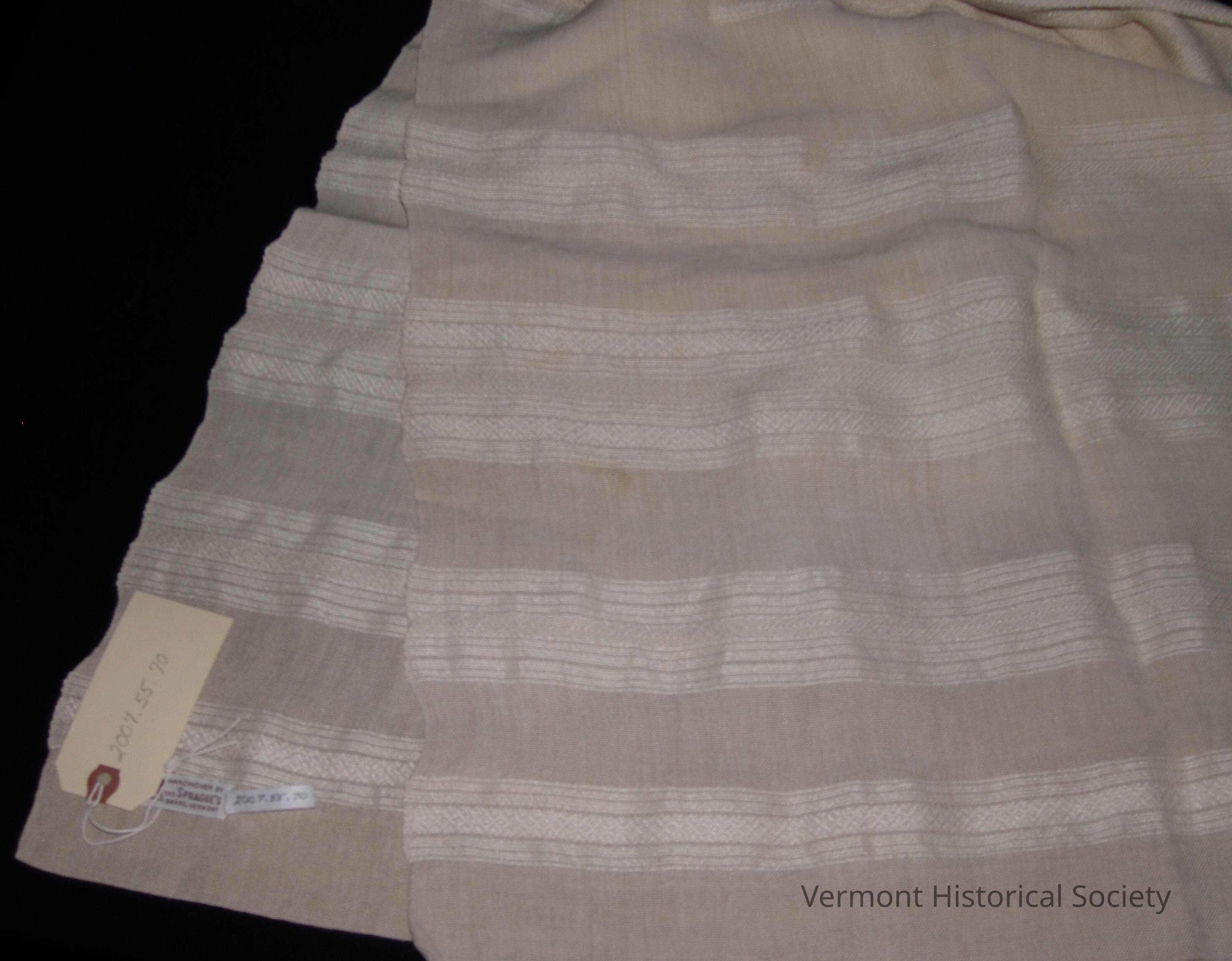 This is a cream-colored handwoven table scarf. The scarf features a textured stripe pattern, which is woven intermittently across the short width of the scarf, and plain weaving for the entire length. There are 2-inch hems at each end of the scarf. On one end of the scarf, there is a machine-made label with brown letters that reads "HANDWOVEN BY THE SPRAGUE'S OF BARRE, VERMONT".Context