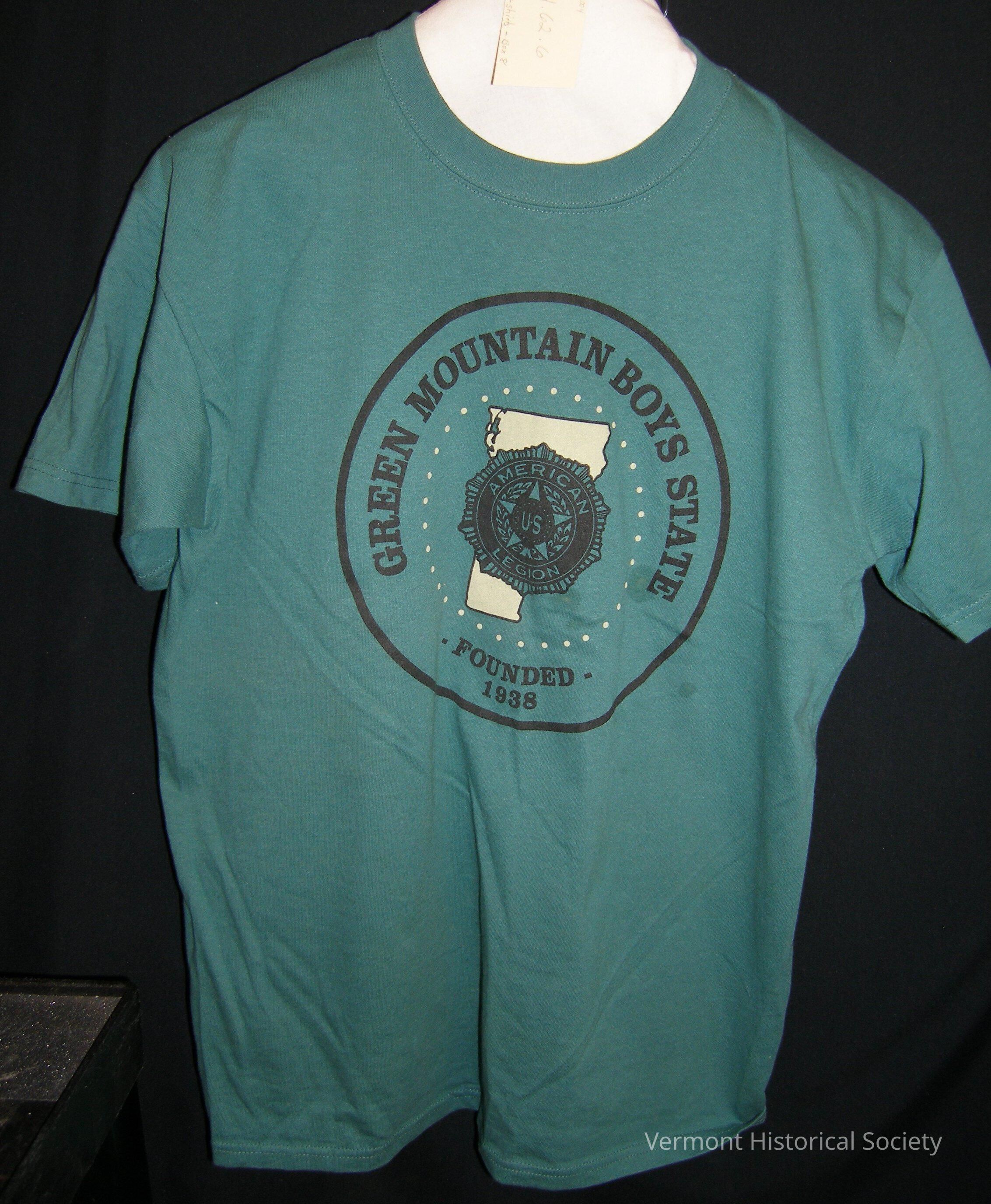 Green t-shirt printed at the center front with the words, "GREEN MOUNTAIN BOYS STATES / FOUNDED 1938" in a circle around a map outline of the state of Vermont with the American Legion logo over it.