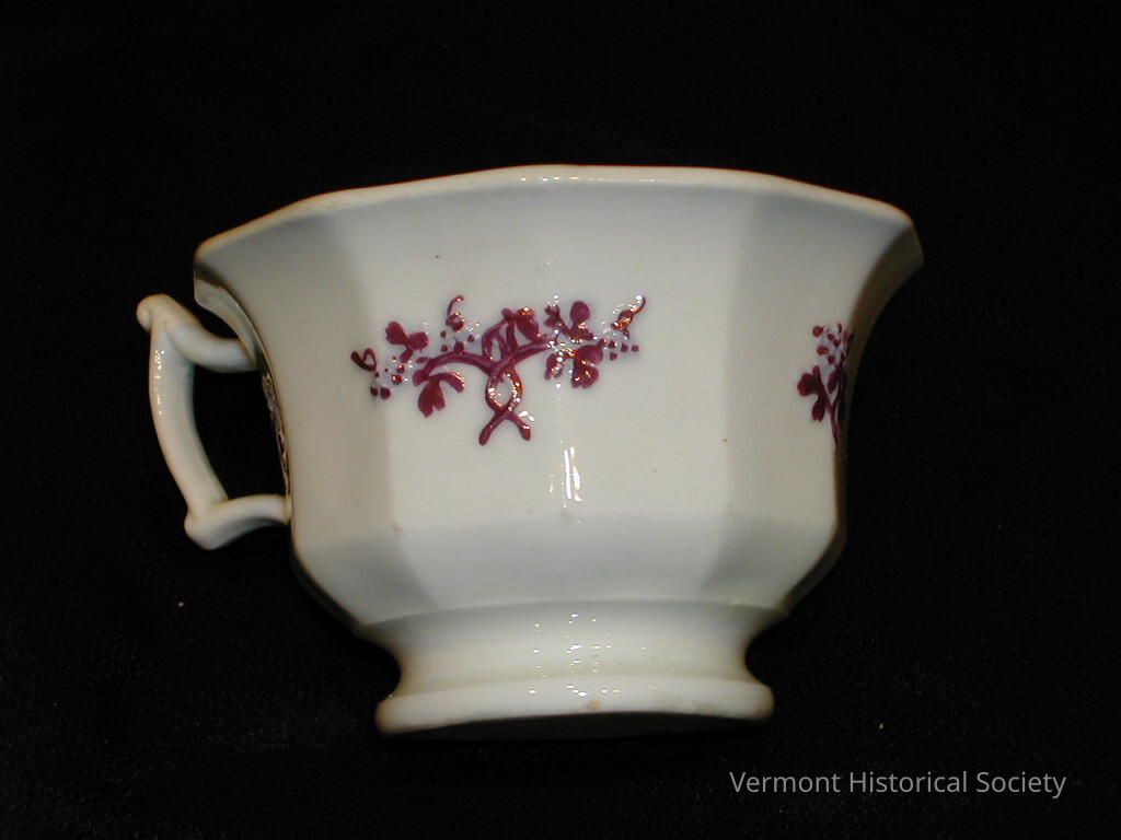 White-bodied teacup decorated with molded purple luster flora sprigs. The faceted cup is flared outward at the lip, and the handle is angular.