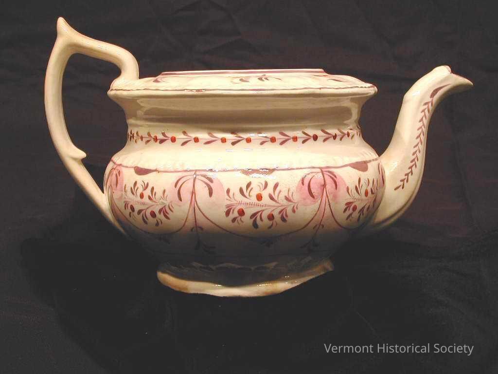 White ceramic teapot with a short, rotund body, widely flared top, and high handle. The body is decorated in a large band of pink luster swags, with leaves at each high point, and sprigs of leaves and berries above each low point. A vine of leaves and berries encircle the join of the body and the rim at the narrowest point. The rim is decorated around the opening with floral sprigs in pink luster.