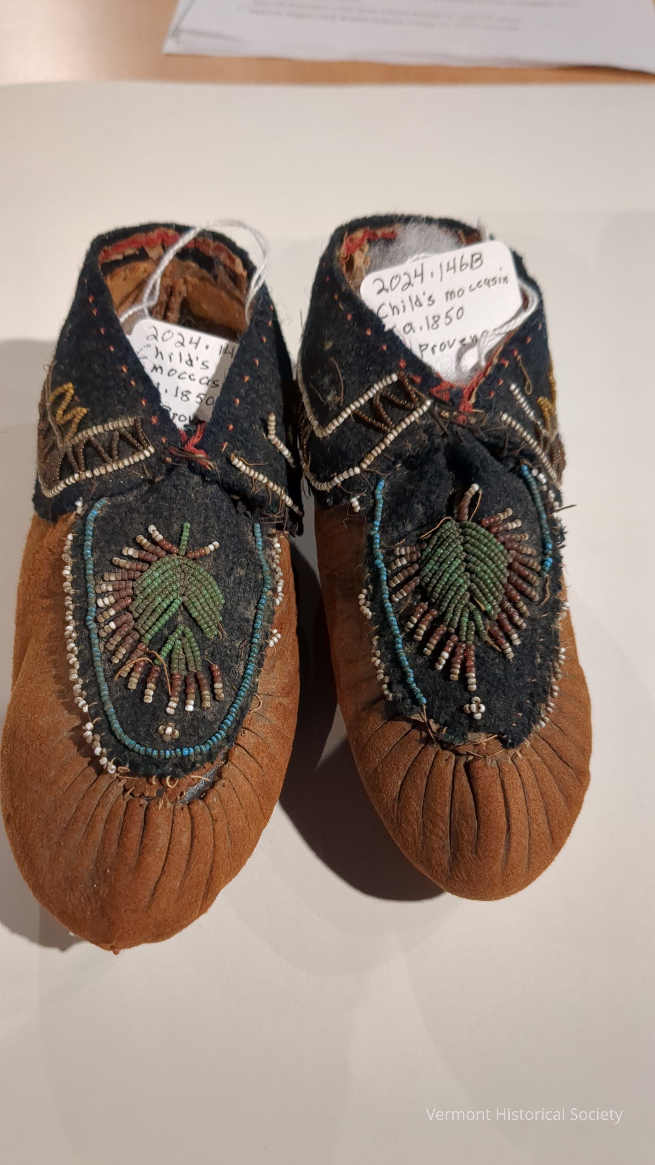 Small, buff moccasins with blue vamps and cuffs. Beaded thistle motif on vamps. Zig-zag border on cuffs.