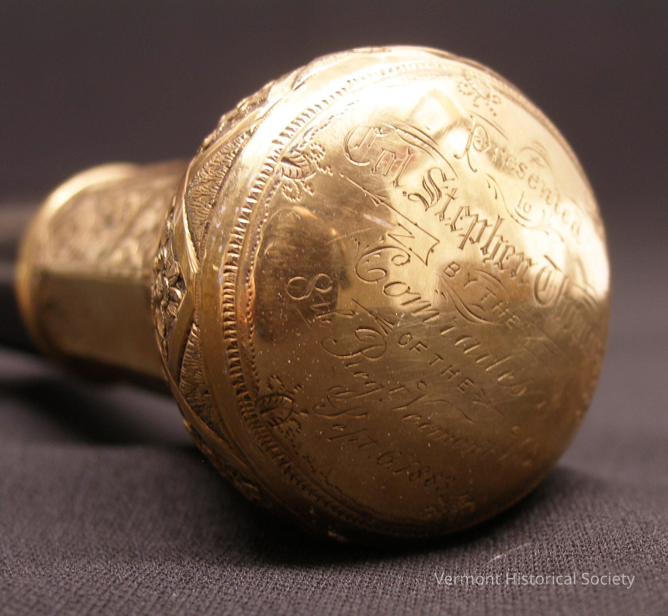 Walking cane "Presented to Col. Stephen Thomas by the Comrades of the 8th Reg. Vermont Vols Sept 6, 1883." The cane is wood, painted black, with a nickel silver tip and a gold engeaved cap with filigree design.