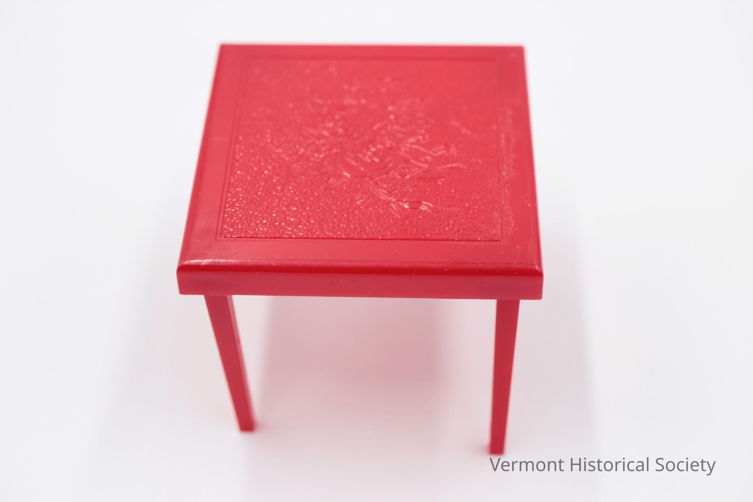 Miniature red plastic card table. The table top is molded with an impression of flowers. The four legs fold under the table. The underside of the table is molded with the words, "A RENWAL PRODUCT NO.--108 MADE IN U.S.A."Context