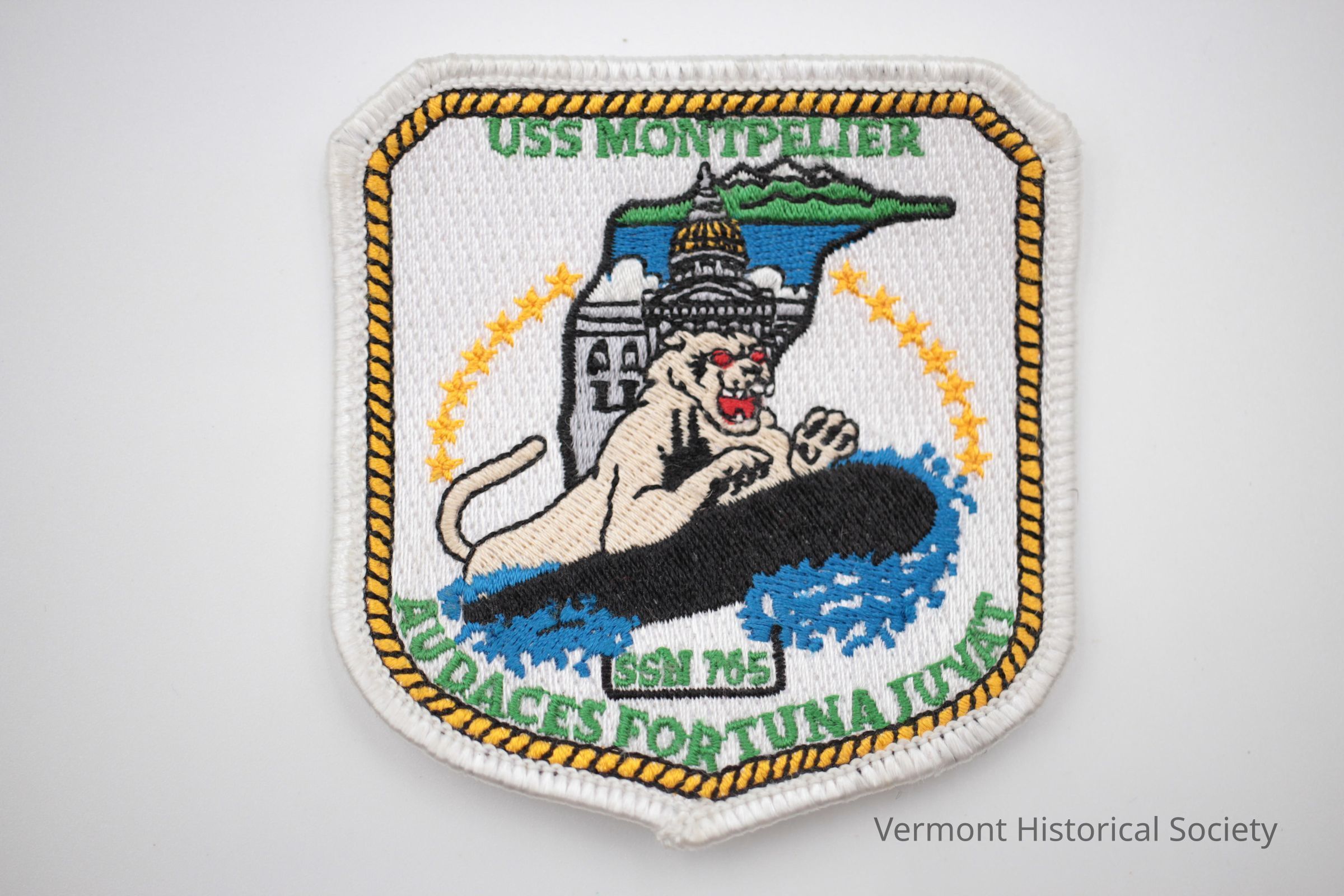 White patch with mountains, the Vermont state capitol, a panther, water, an arc of yellow stars and in green lettering, the words "USS Montpelier, SSN 765, Audaces fortuna juvat."Context