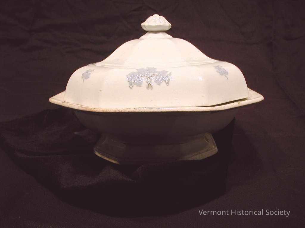 Six-sided covered dish. The dish is decorated with molded grape vines in light blue.