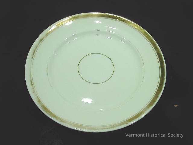 White ceramic luncheon plate with a plain band of gilding around the edge, a gilded circle around the cheek, and gilded circle in the center.