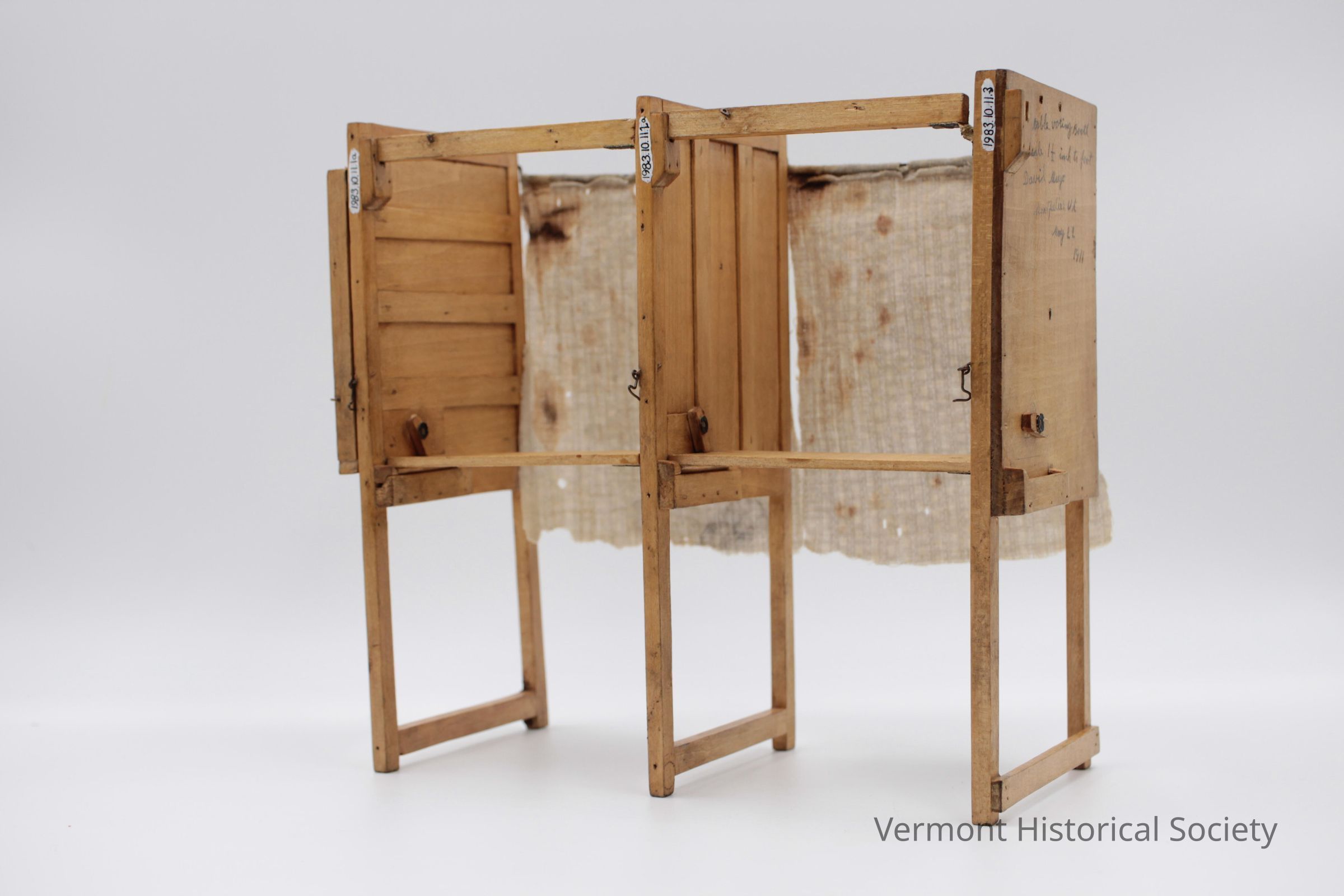 Vermont has long been proud of its democratic traditions, from Town Meeting Day debates to strong participation in local government. Much of our polling takes place in multi-use locations – school gymnasiums, church basements, grange halls, and other community gathering spaces. With this in mind, David Mayo’s design for a portable voting booth that could be folded up and stored flat when not in use made a lot of sense.