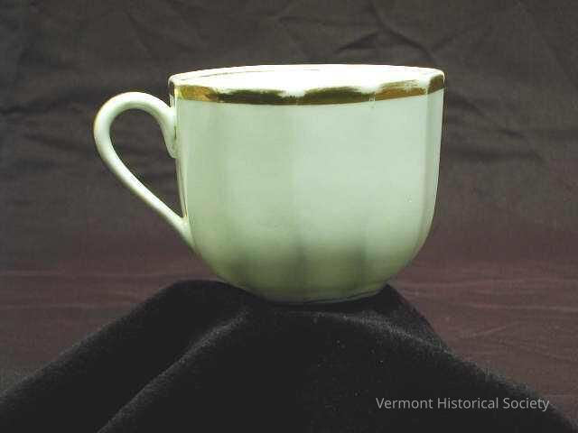 White ceramic teacup with gilding around the rim. The cup has a handle, and the body is molded into 14 facets.