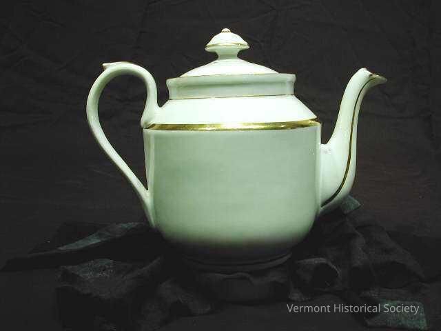 White porcelain teapot with bands of gilding around the lid, lid handle, shoulder, and along the spout and handle. The body of the pot has straight sides, which angle sharply inward toward the opening. The lid has a round center handle.Context