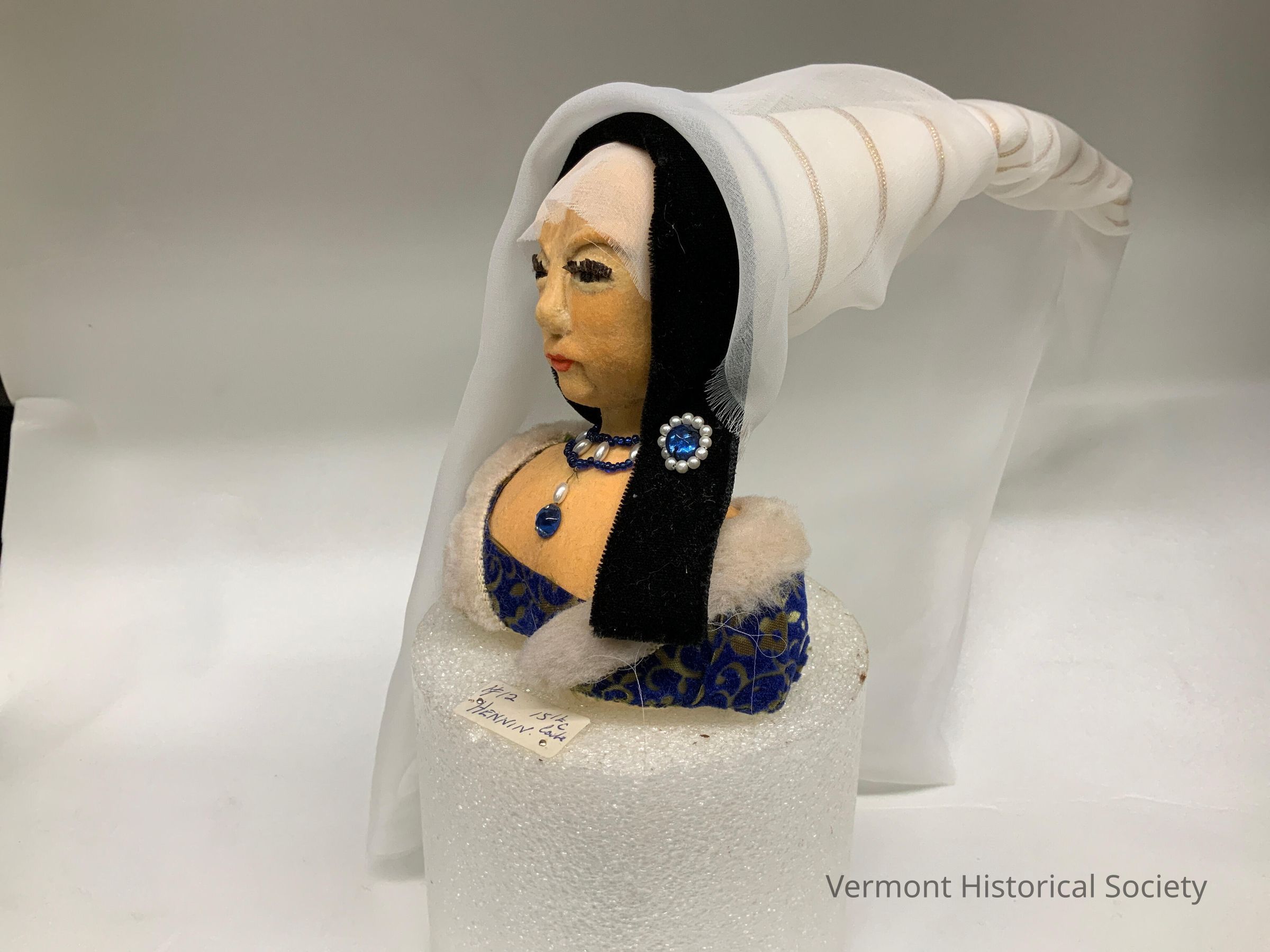 The bust is wearing a headdress consisting of a long white cone extending backward from the head, wrapped in gold string and draped with sheer white fabric. A rectangle of black velvet is draped over the head, extending the shoulders, that is decorated with a blue gem surrounded by white beads.