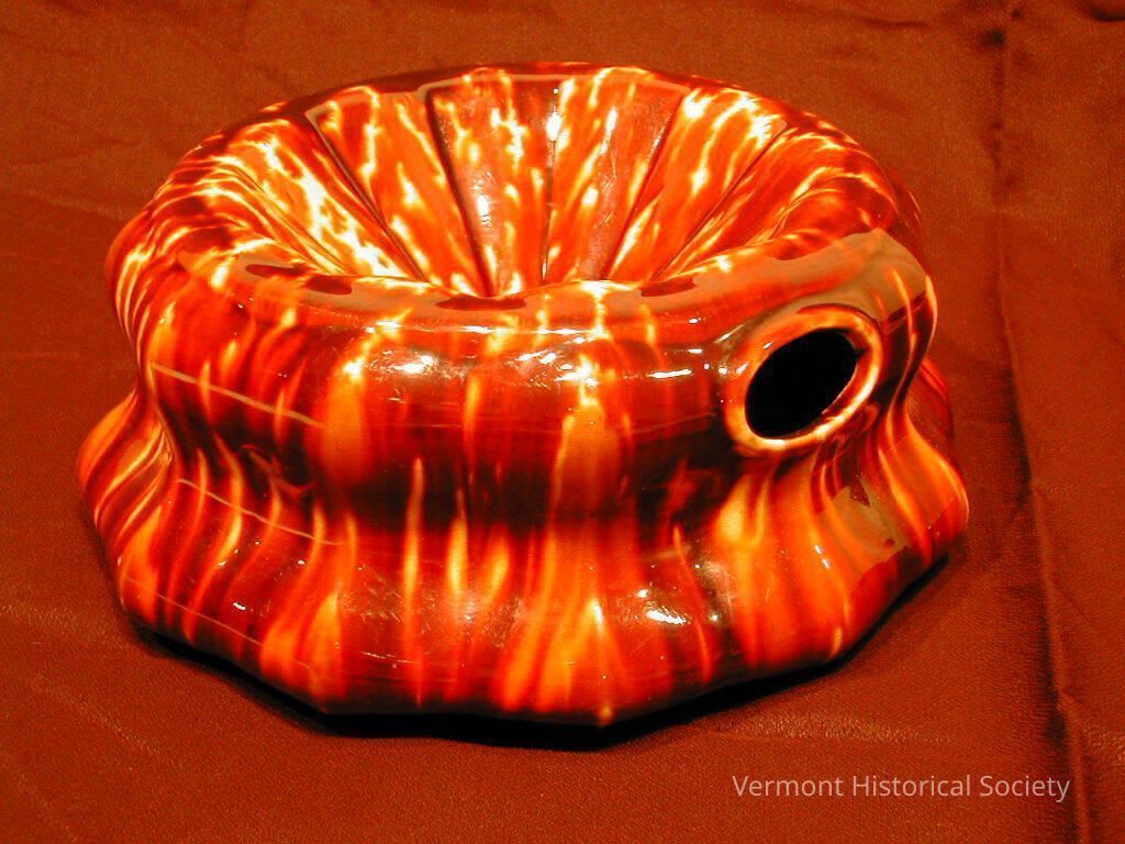 Ceramic spittoon with mottled brown glaze. The body of the spittoon is concave around the exterior, and the top slopes downward to a circular hole. One side has an oval drainage hole. The bottom is impressed with the label, "Lyman Fenton & Co."Use