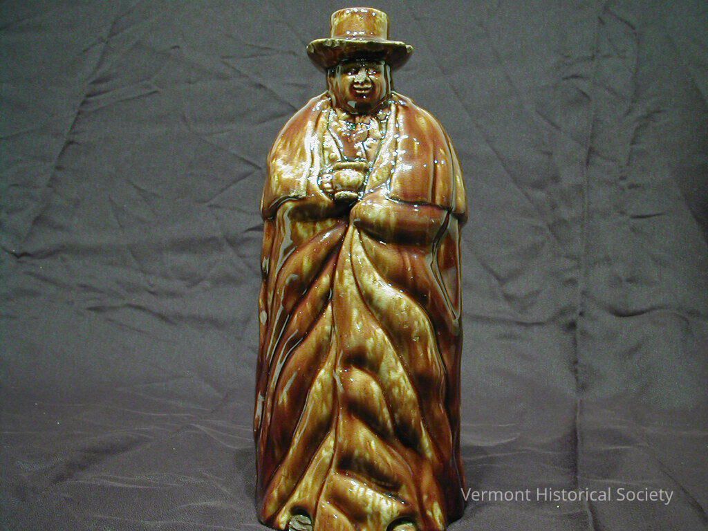 Ceramic bottle in the shape of a man. The bottle has a mottled brown glaze. The man is shown wearing a long, full cloak, clutching it closed in the front. Above the closure he is holding a round mug. He is wearing a brimmed hat.