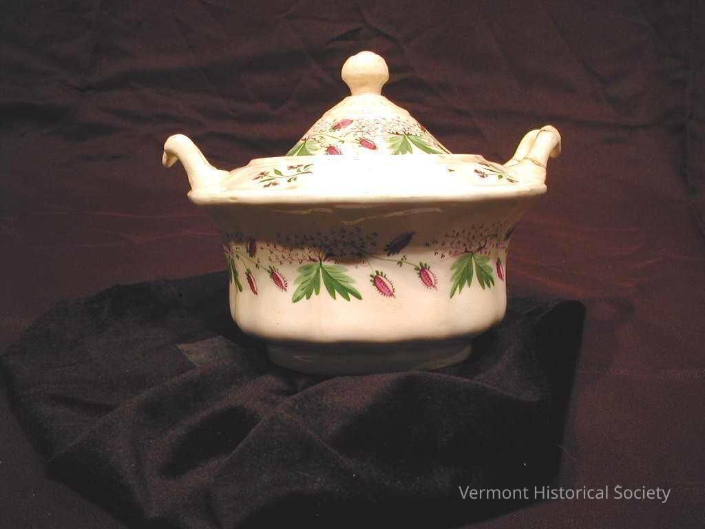 Round sugar bowl and lid. The bowl and lid are decorated with a hand-painted design of vines of pink fruits or flowers. The bowl sits on a short pedestal base and has straight sides that flare out dramatically at the top before coming back in into a sort of half-lid or upper rim. Two handles are set into the upper rim. A round, domed lid sets into the rim and had a central finial handle.