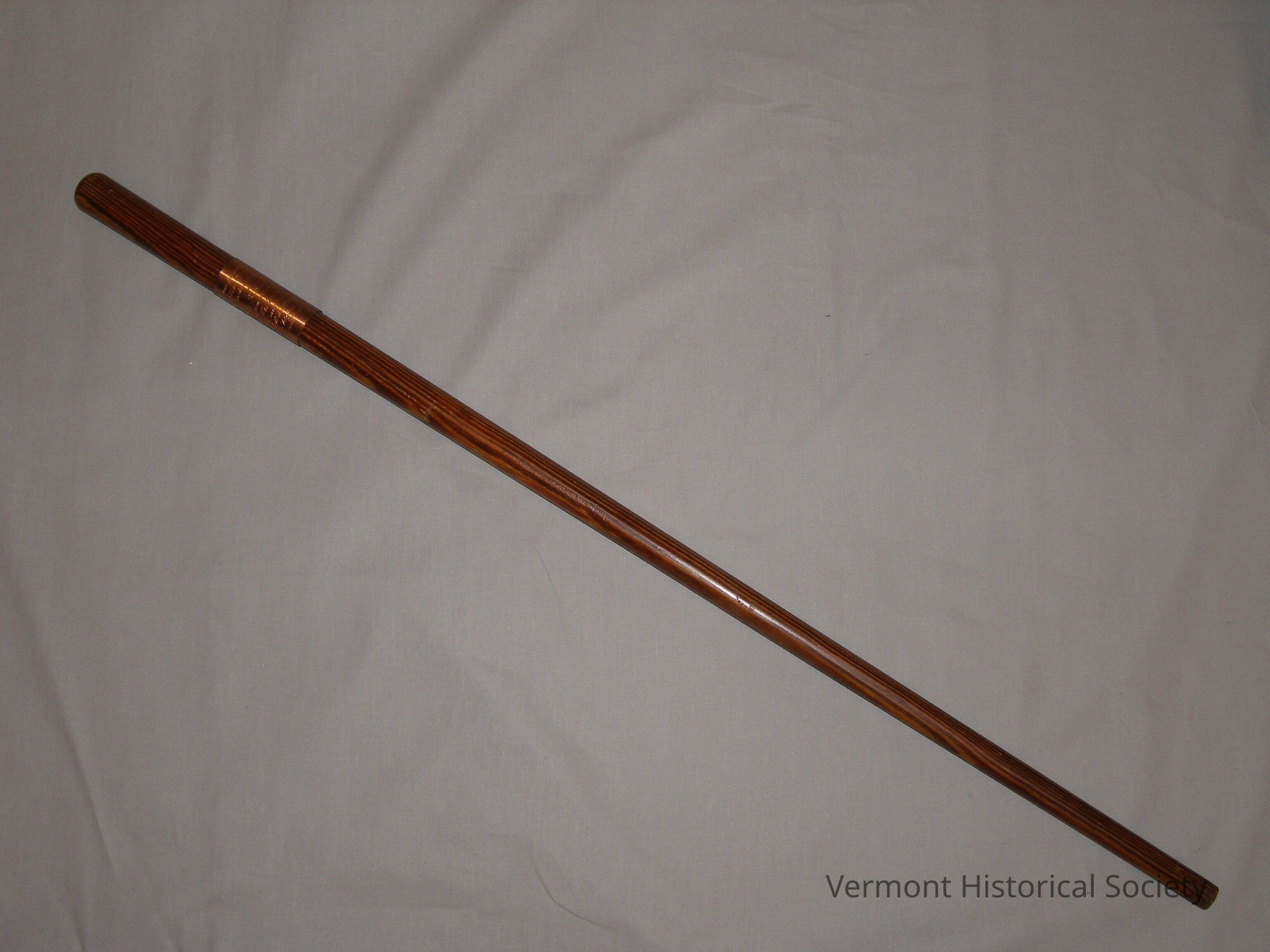 Plane wooden cane with copper band. The can is straight, with no knob or handle, and tapers toward the bottom. The band is engraved with the inscription, "This cane presented by Horatio N. Taplin of Washington ,D.C. to George L. Blanchard and by him turned over to the Vermont Historical Society was made from wood from the old bridge over which all the Northern Troops passed into Virginia during the Civil War"