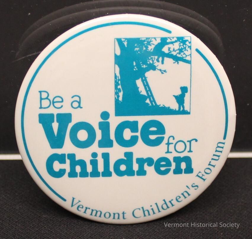 Round white button with green lettering and image of a silhouette showing a child in a tree with a ladder leaning against the trunk, with another child looking up. Text on the button: Be a Voice for Children / Vermont Children's Forum. (See Notes field for more information.)Context