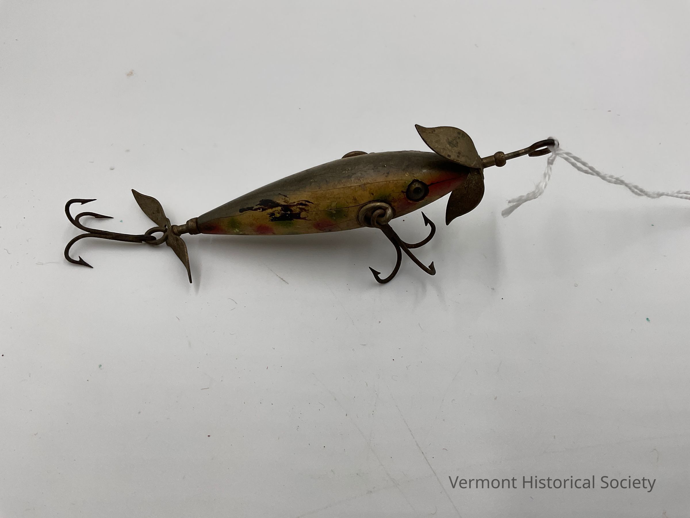 Wood and metal fishing lure. The wooden section is shaped like a fish with what appear to be glass, inset eyeballs. The wooden body has a dark streak across the top of the back running tip to tail, and green and red spots on the sides. The lure has three sets of barbed hooks. Two have three hooks and one has two. They are located on the sides and the tail. There is also a metal spinner at the tail end and another at the top of the lure.