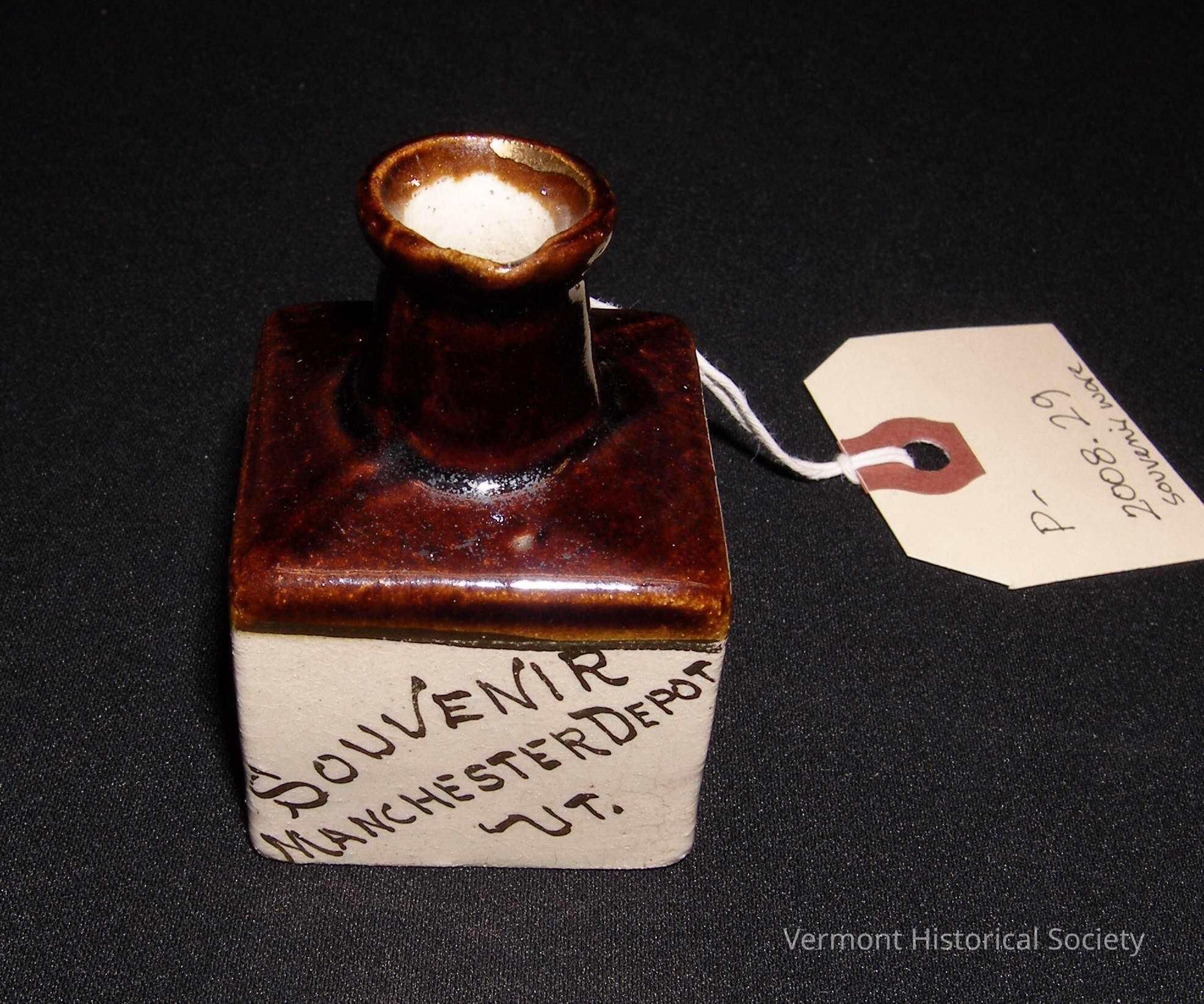Miniature ceramic jug with four straight sides. The body is glazed a cream color, and the shoulder and spout are glazed dark brown. One side is painted with the inscription, "Souvenir Manchester Depot Vt."