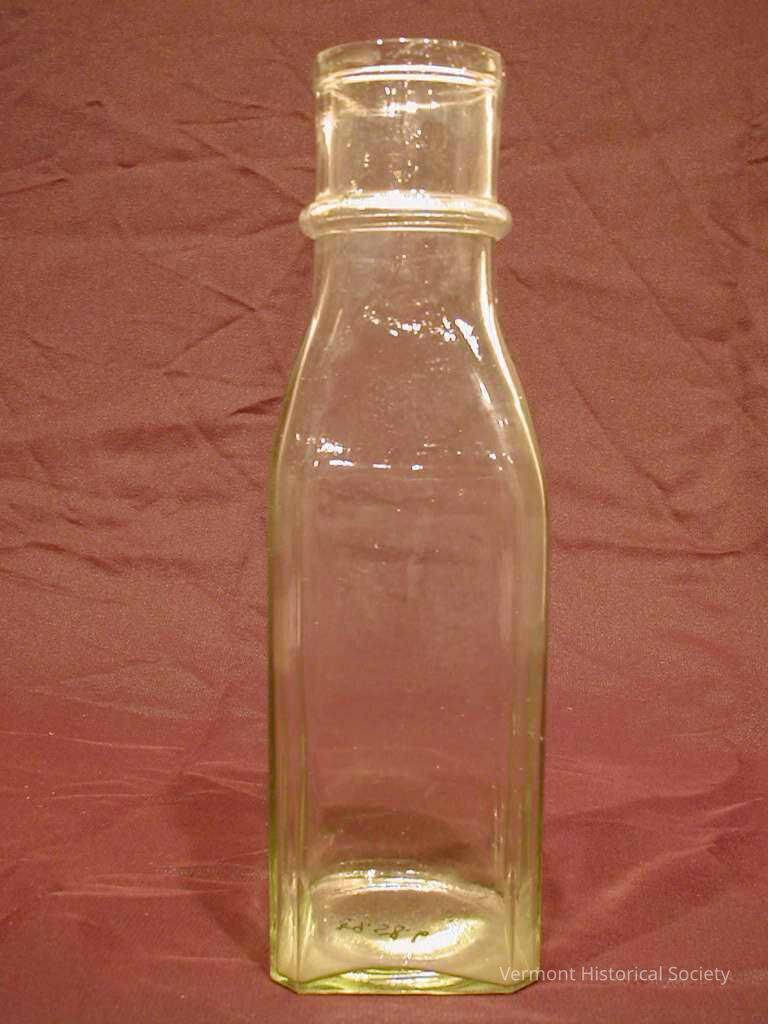 Glass pickle bottle. The glass is mostly clear, but has a slight green tinge. It has a round neck and opening and a square body.