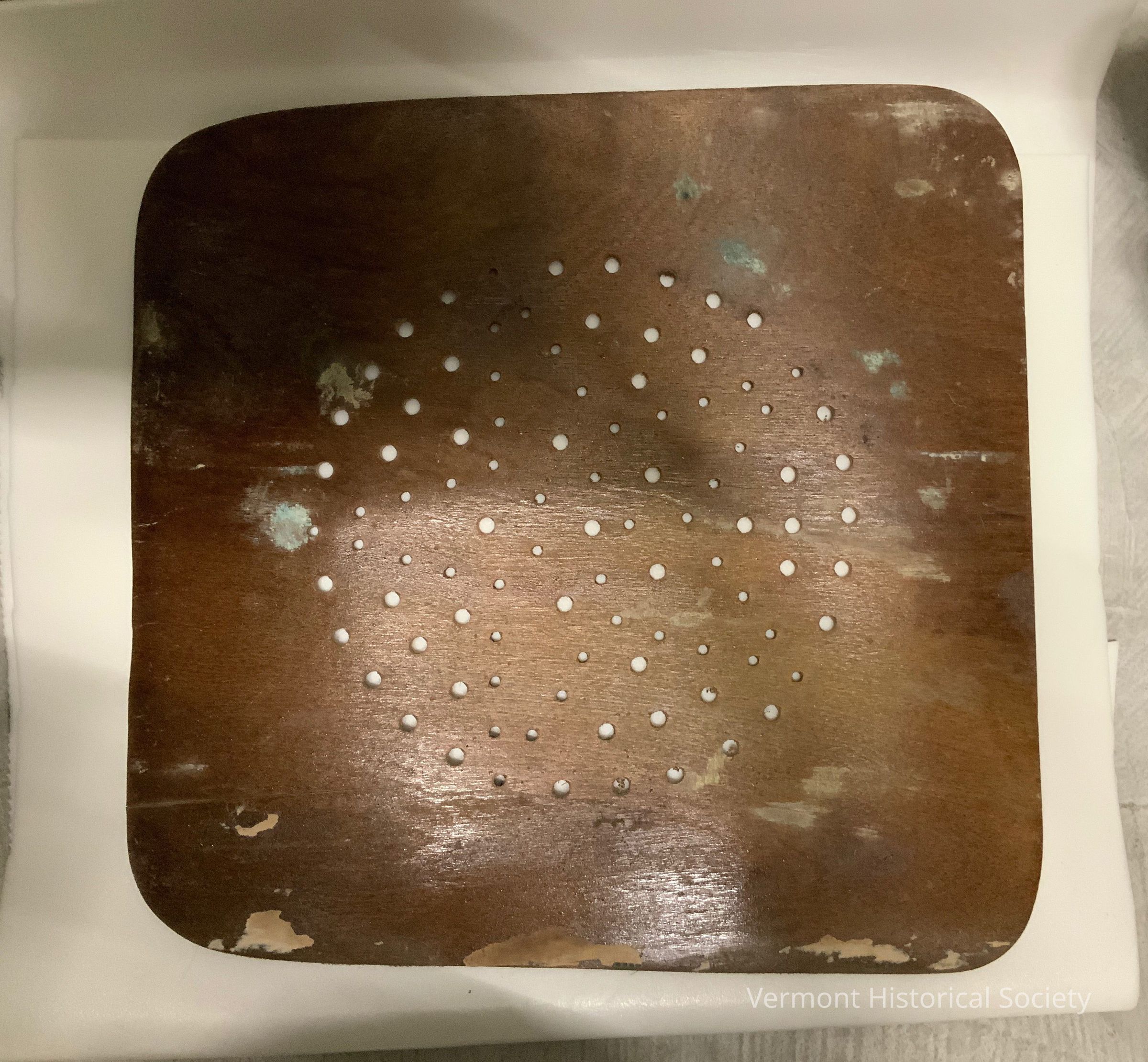 Solid wooden chair seat that has been drilled with small holes of various sizes in a circular pattern. The pattern is centered on the seat.
