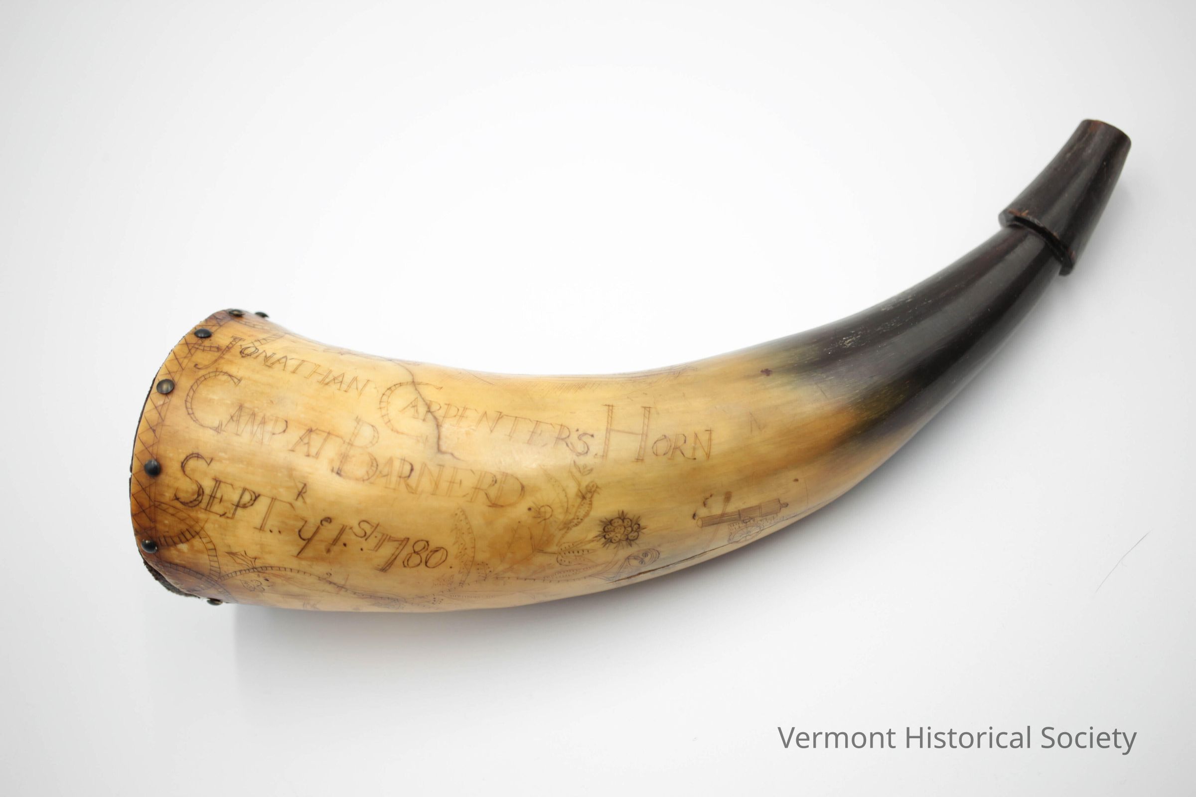 Jonathan Carpenter made this powder horn while he was serving in the militia at Fort Defiance in Barnard during the Revolutionary War. After the Royalton Raid on October 16, 1780, his unit chased the British and Mohawk attackers but was not able to catch them.