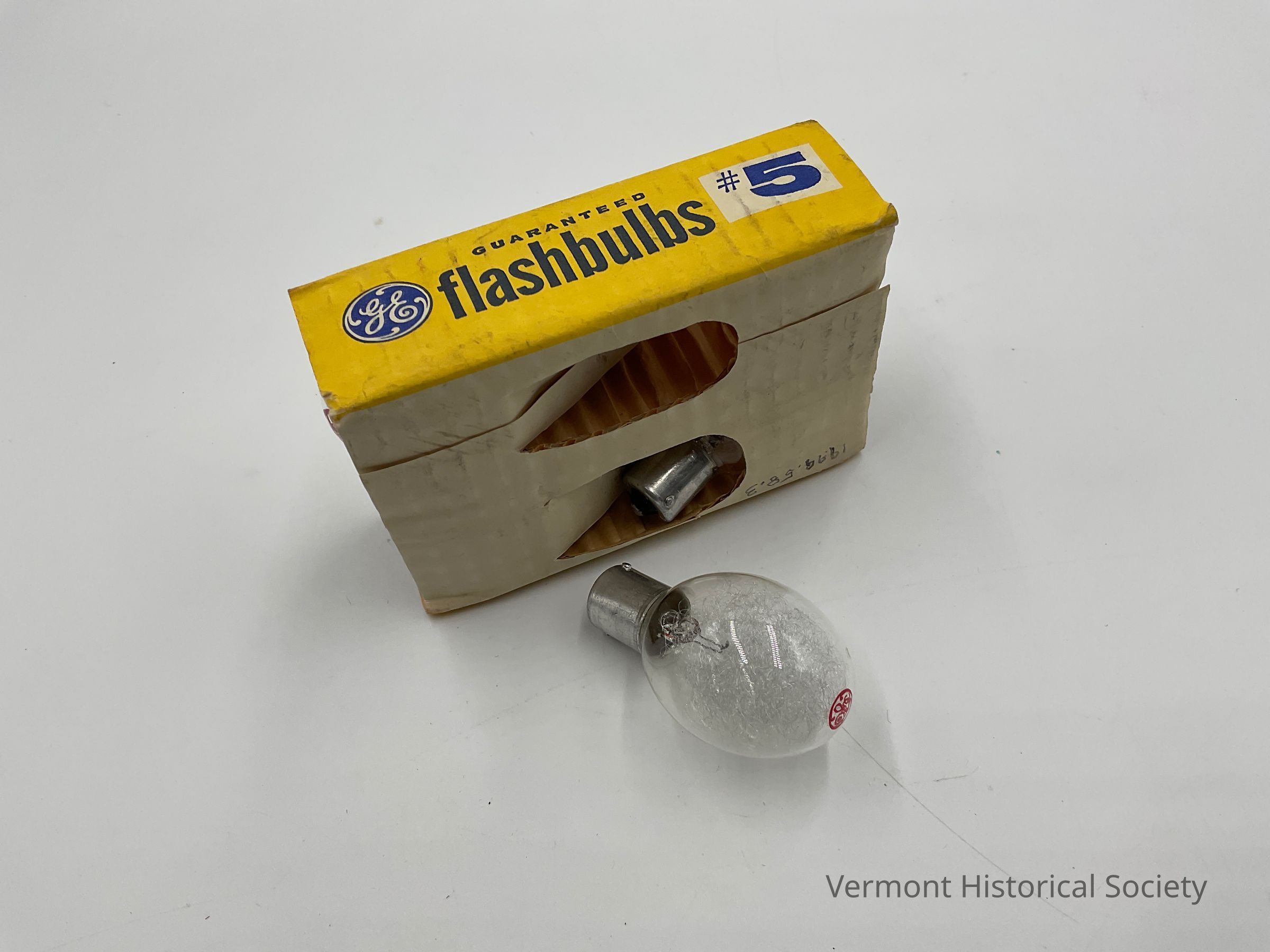 Yellow and white cardboard container with four camera flashbulbs made by General Electric Co. The package says these are #5 size bulbs. One side of the packaging lists shooting distance suggestions and a warning about potential hazards. The bulbs were made in the U.S.A. The bulbs have the G.E. logo on them in red.