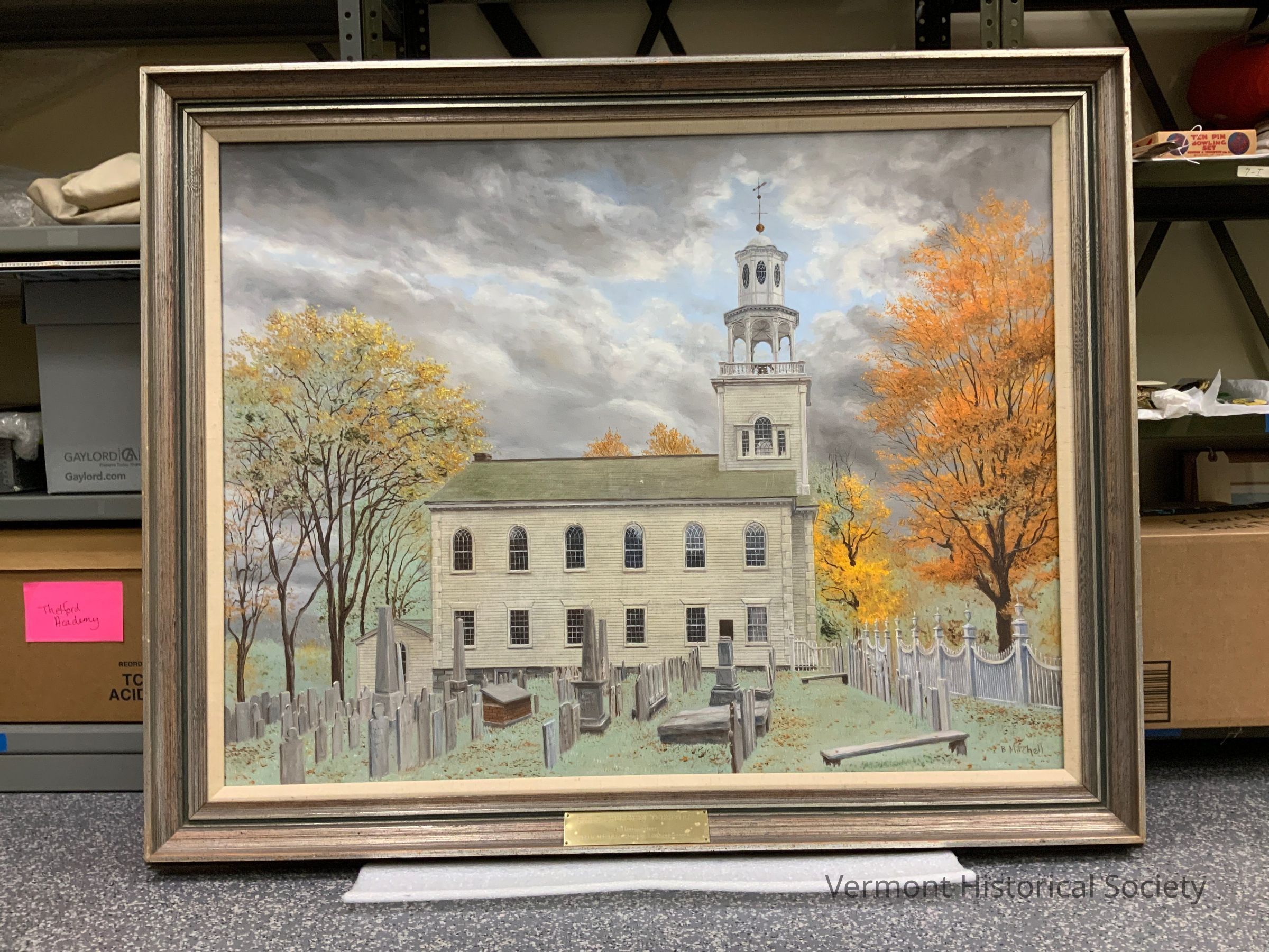 The title of this painting is a bit misleading. The first Congregational congregation in the territory that is now Vermont was established in Bennington in 1762 with a meeting house erected in 1766. The current church, as depicted in this painting, was built in 1805 and is one of the oldest continually operating church structures in the state.Acquisition