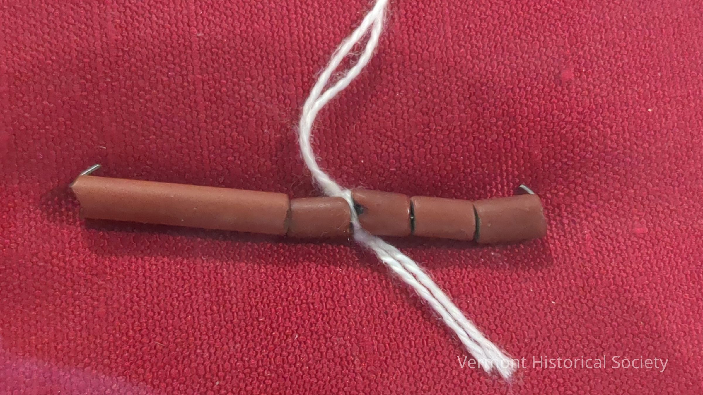 String of five "Green Heart" pattern beads. One bead is long or "bugle," the others are short.