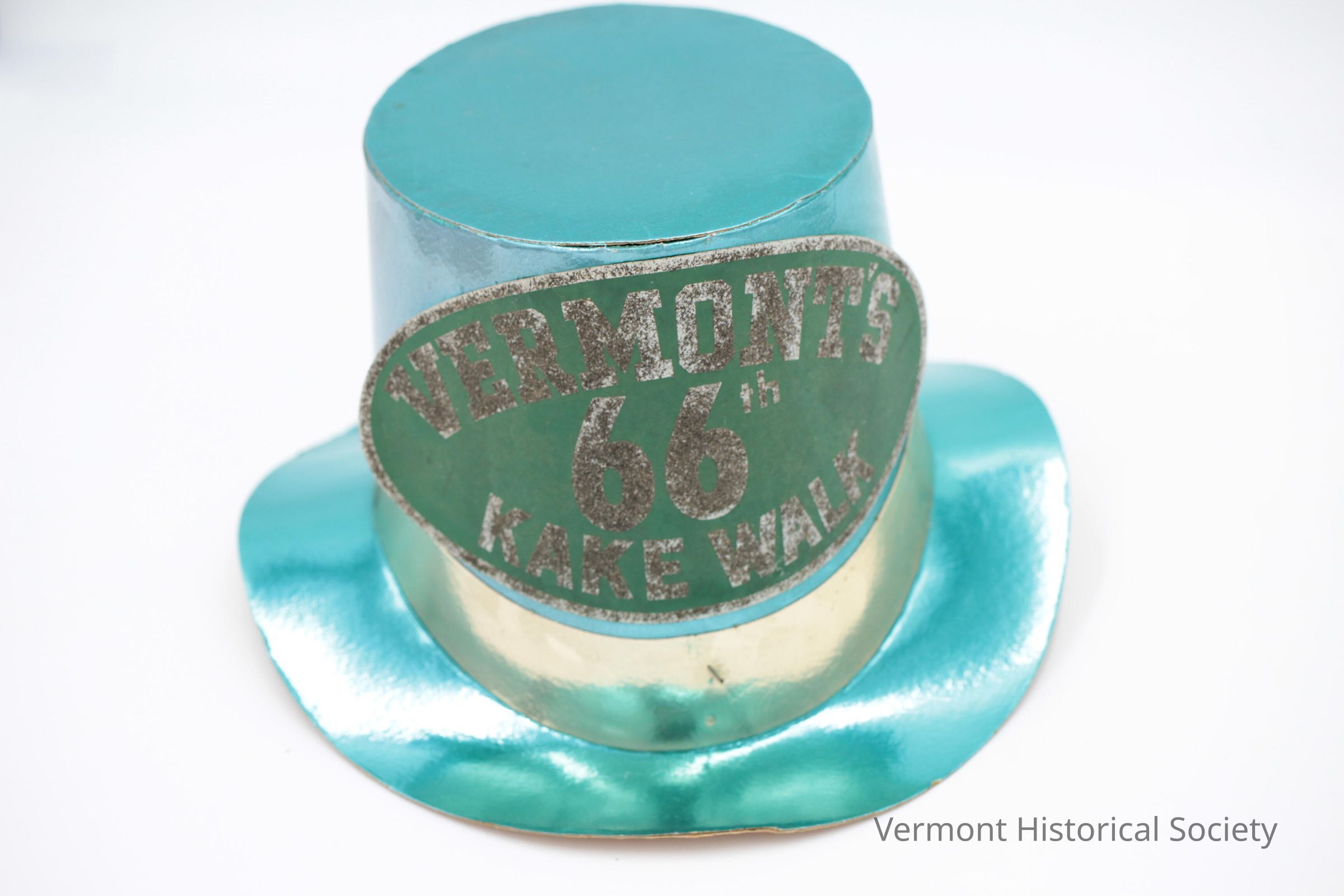 Shiny green cardboard top hat with oval label reading "VERMONT'S 66TH KAKE WALK". The hat tapers toward the top and has a round brim. The label is attached to the center front of the hat, flaring away from the hat at the sides. The words are white on a green ground, and are covered in silver glitter.Context