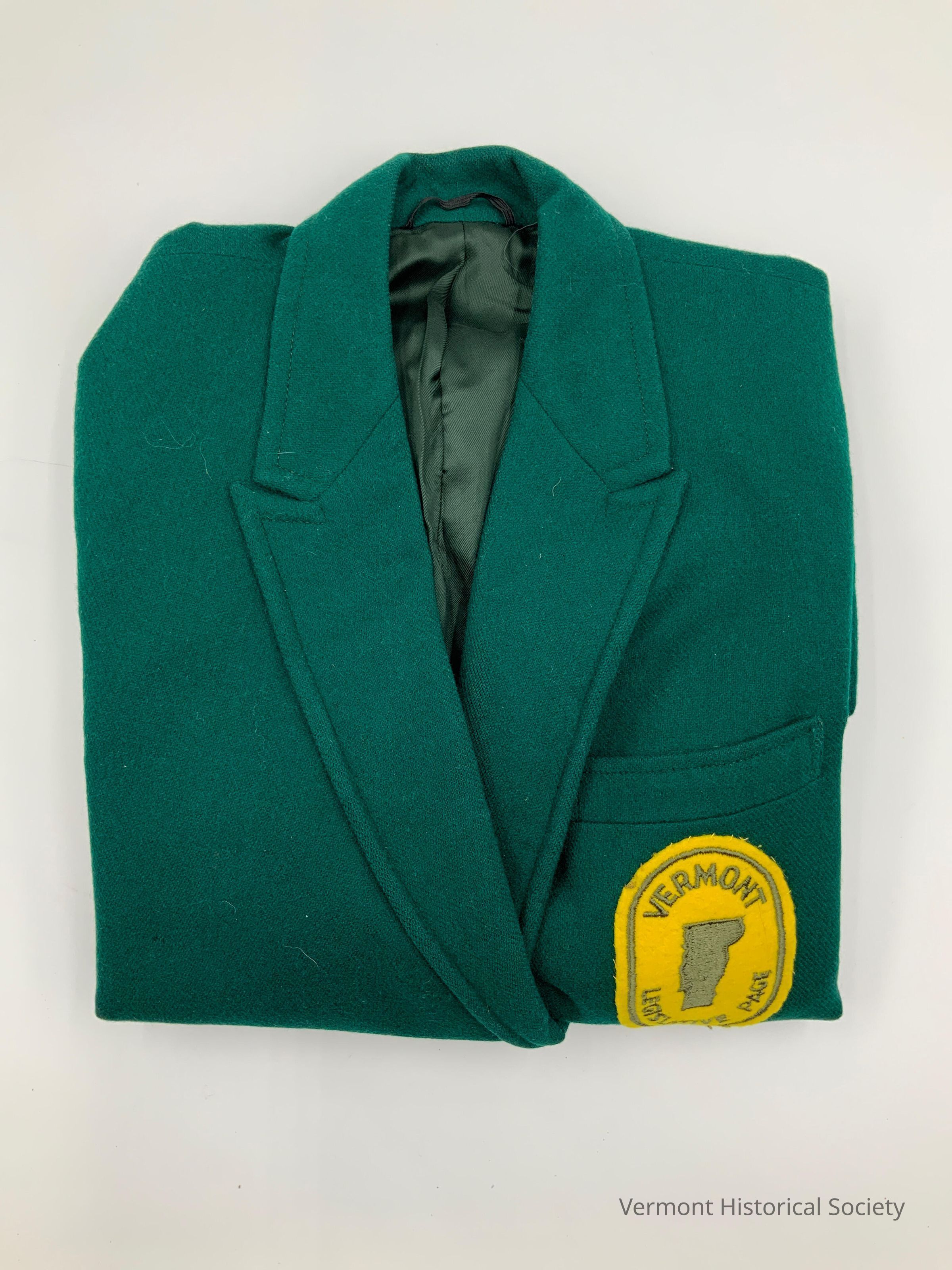 Green blazer with a Legislative Page patch on the front. The patch is a yellow oval embroidered in green with the state of Vermont and the inscription, "VERMONT LEGISLATIVE PAGE."