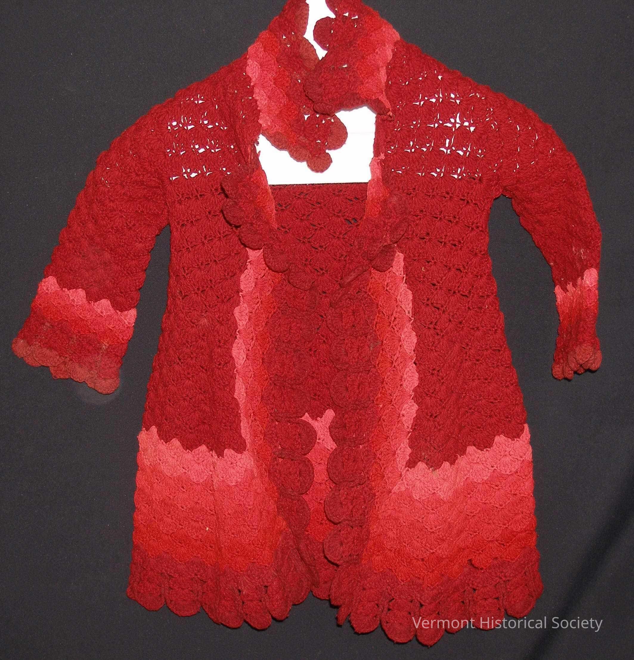 Red jacket sized for a child. It is crocheted using a shell stitch. The sleeve cuffs, center front edge opening, collar, and hem are crocheted in rows of different shades of red and pink, giving them a gradient effect. It opens down the center front, and there are no closures.Context