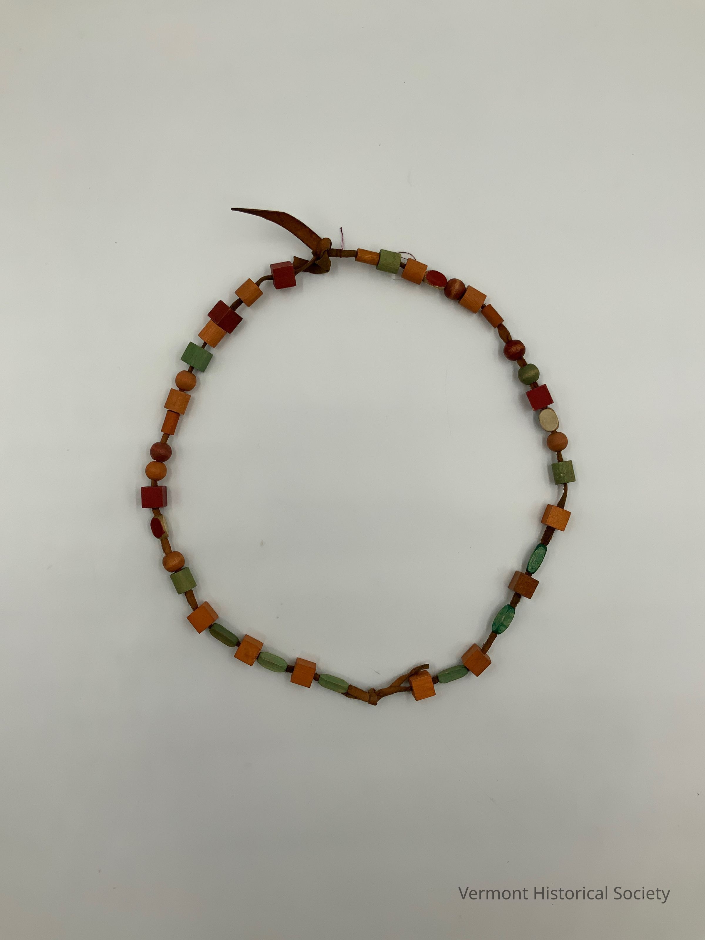 Necklace consisting of wooden beads in various shapes and colors strung on a length of leather cord. The cord is knotted into a loop.