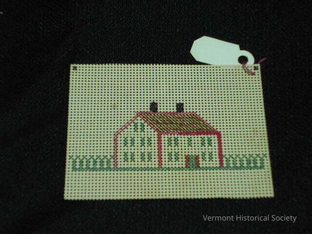 Needlework design on a punched paper card. The design is a large house.